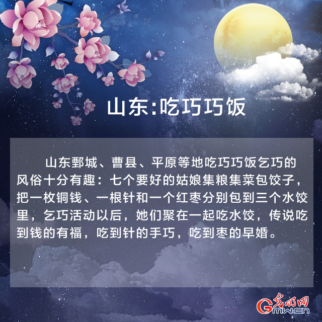 山東鄄城、曹縣、平原等地吃巧巧飯乞巧的風(fēng)俗十分有趣:七個(gè)要好的姑娘集糧集菜包餃子,把一枚銅錢、一根針和一個(gè)紅棗分別包到三個(gè)水餃里,乞巧活動(dòng)以后,她們聚在一起吃水餃,傳說(shuō)吃到錢的有福,吃到針的手巧,吃到棗的早婚。