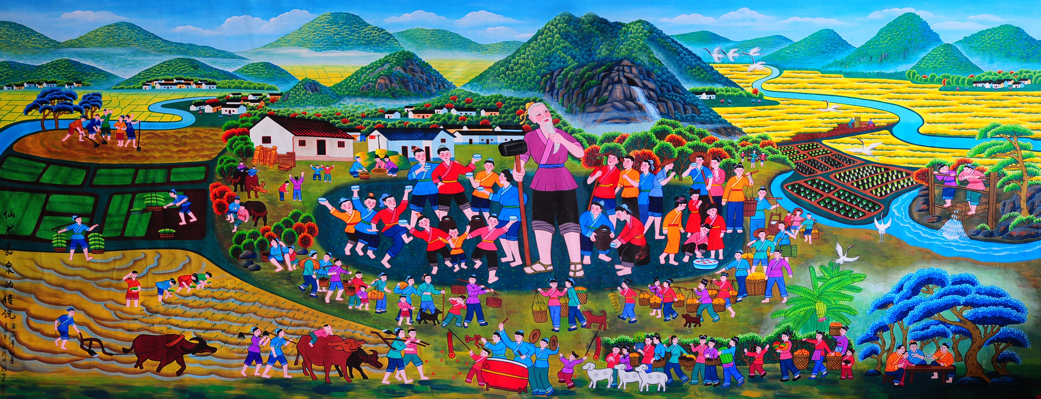 龍門農(nóng)民畫《仙龍嘉泉的傳說》,展現(xiàn)王賓風(fēng)情。 黃偉平、梁彩歡、駱雪芳繪。惠州日?qǐng)?bào)記者侯縣軍 翻拍