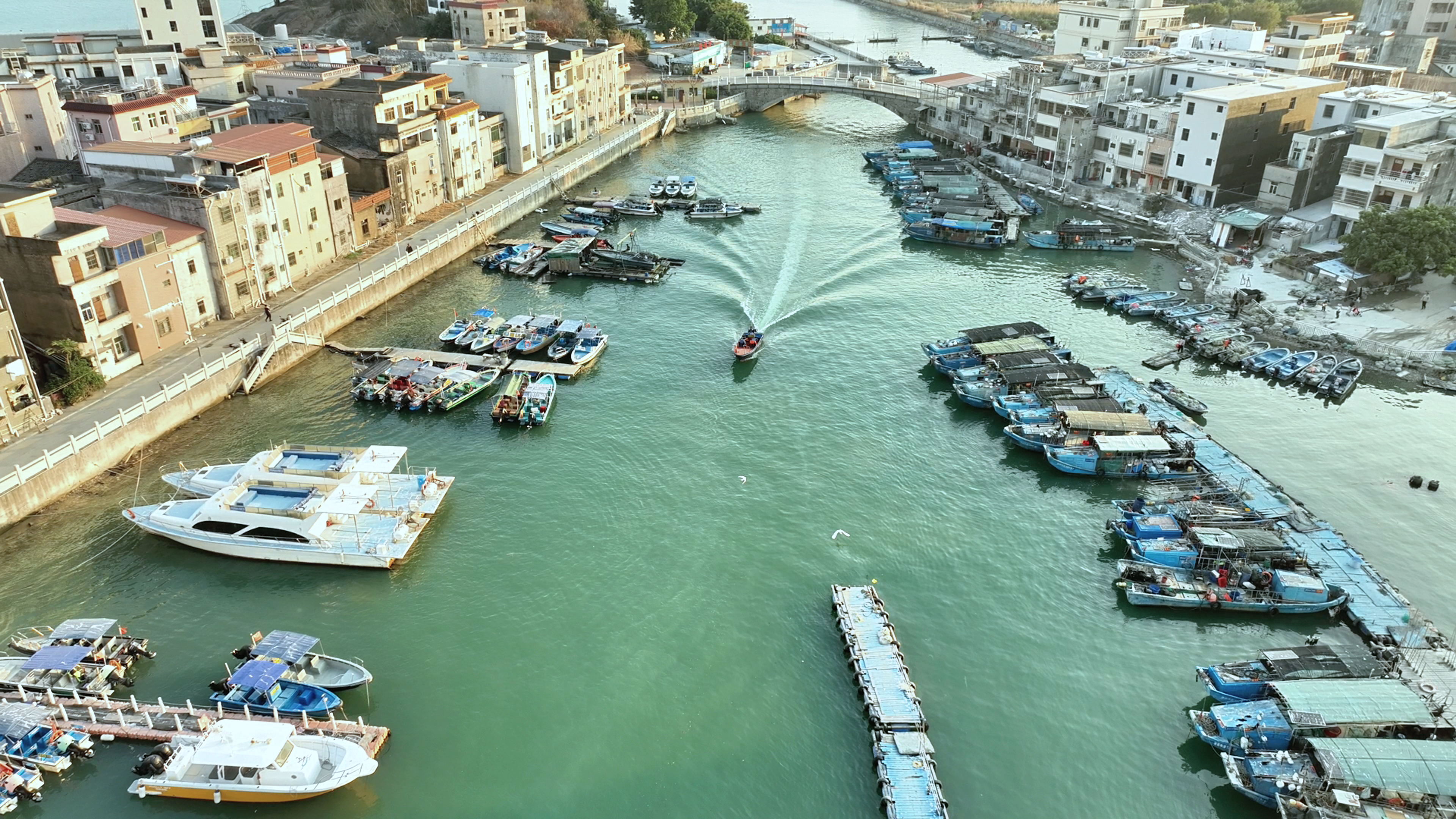 東側(cè)為霞新村,一排排居民房緊密相連,沿河依次而立。風(fēng)和日麗時(shí),沿著包禾塘東側(cè)人行道漫步,別有一番風(fēng)情。傍晚漲潮時(shí),一艘艘休閑漁船在岸邊整齊排列,三五成群的白鷺或在船篷上棲息,或在水面覓食。眼前風(fēng)景讓人頓感歲月靜好。