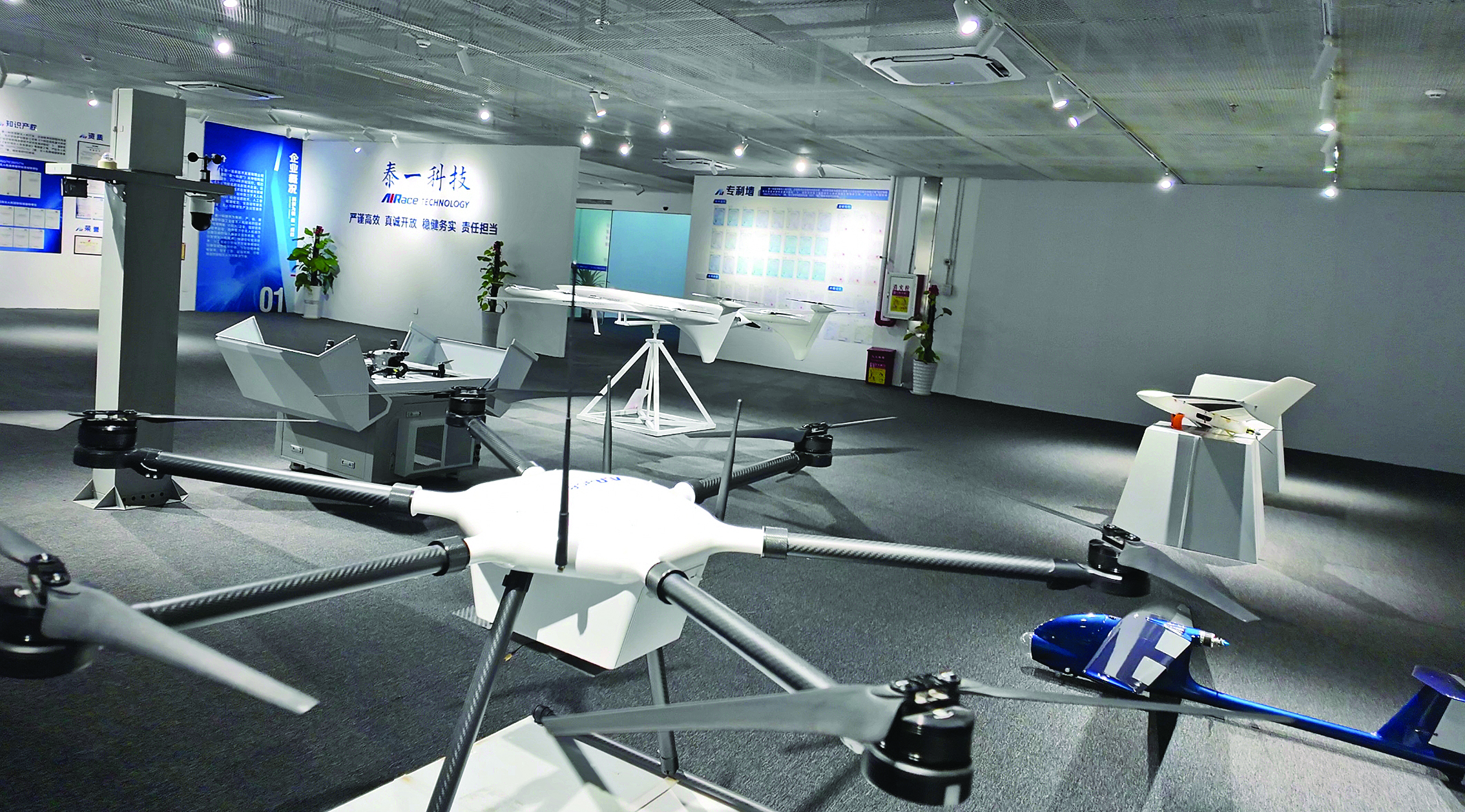 廣東泰一高新技術(shù)發(fā)展有限公司展廳內(nèi)的無人機(jī);葜輺|江圖片社供圖