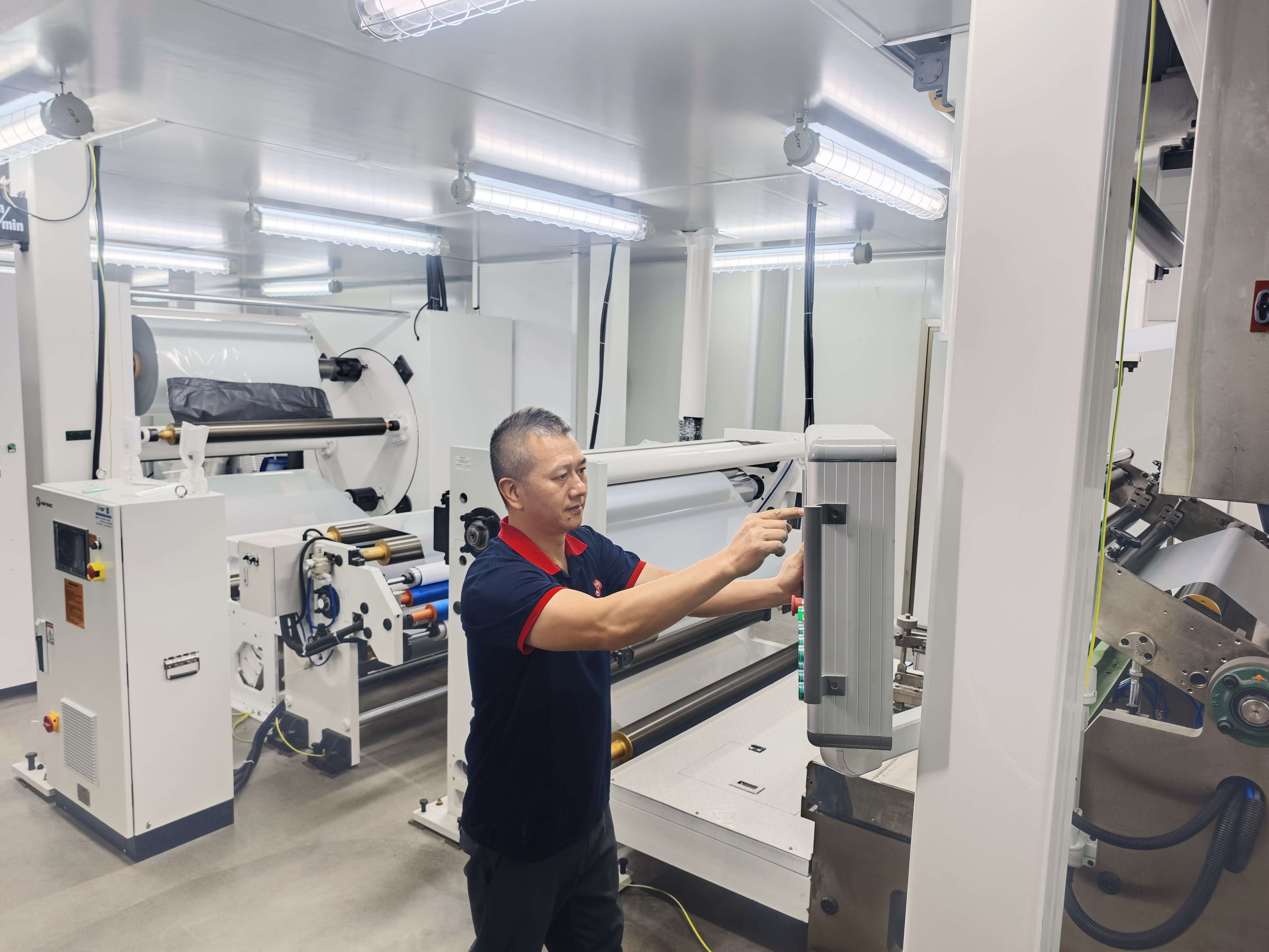 工人調(diào)試機(jī)器的各項(xiàng)參數(shù)后,經(jīng)過一系列工序,一張張薄膜被生產(chǎn)出來。