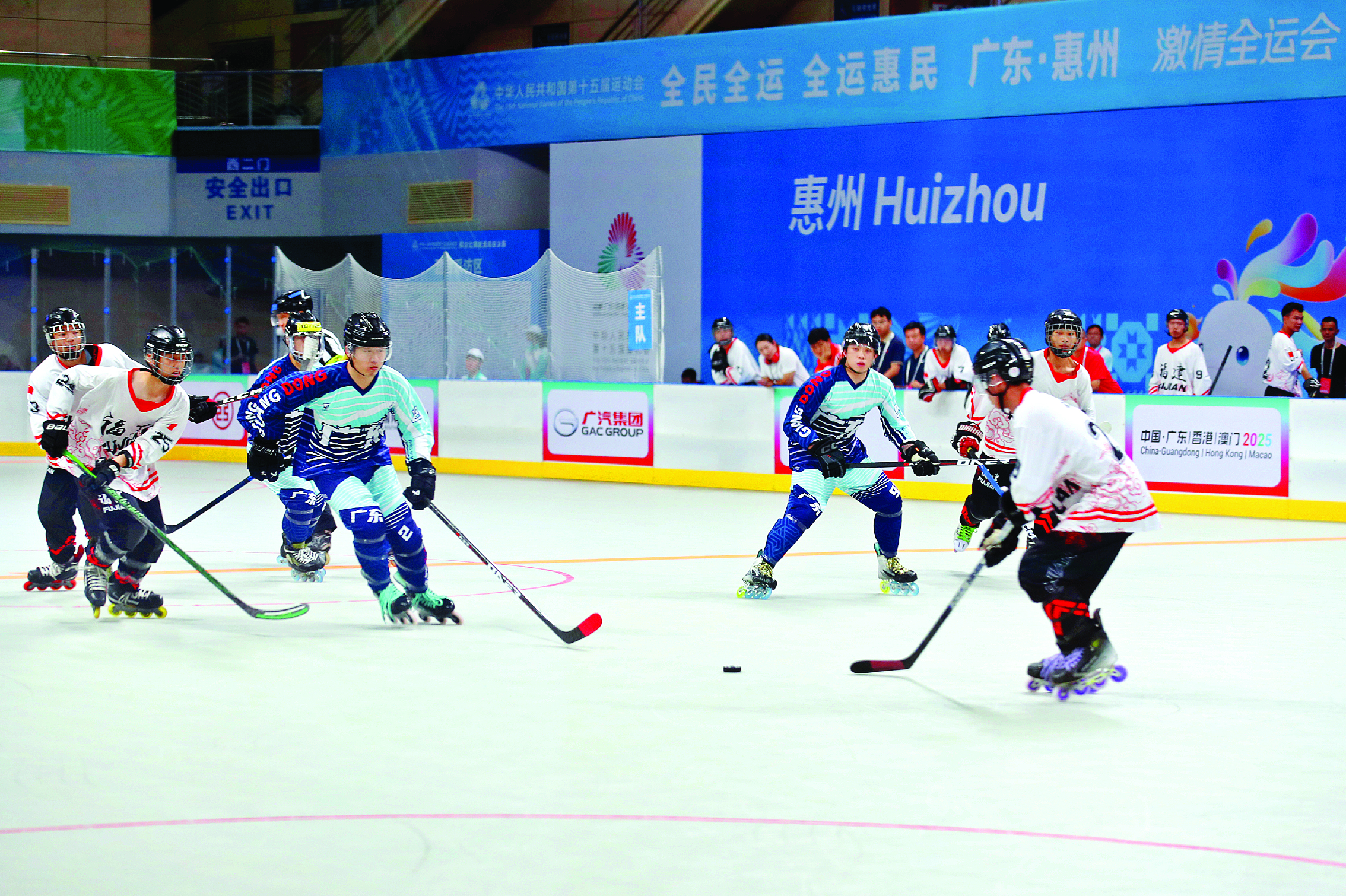 10月15日晚,第十五屆全運(yùn)會單排輪滑球項目決賽男子組小組賽,廣東隊(藍(lán)衣)13:1戰(zhàn)勝福建隊(白衣)。 惠州日報記者鐘暢新 攝