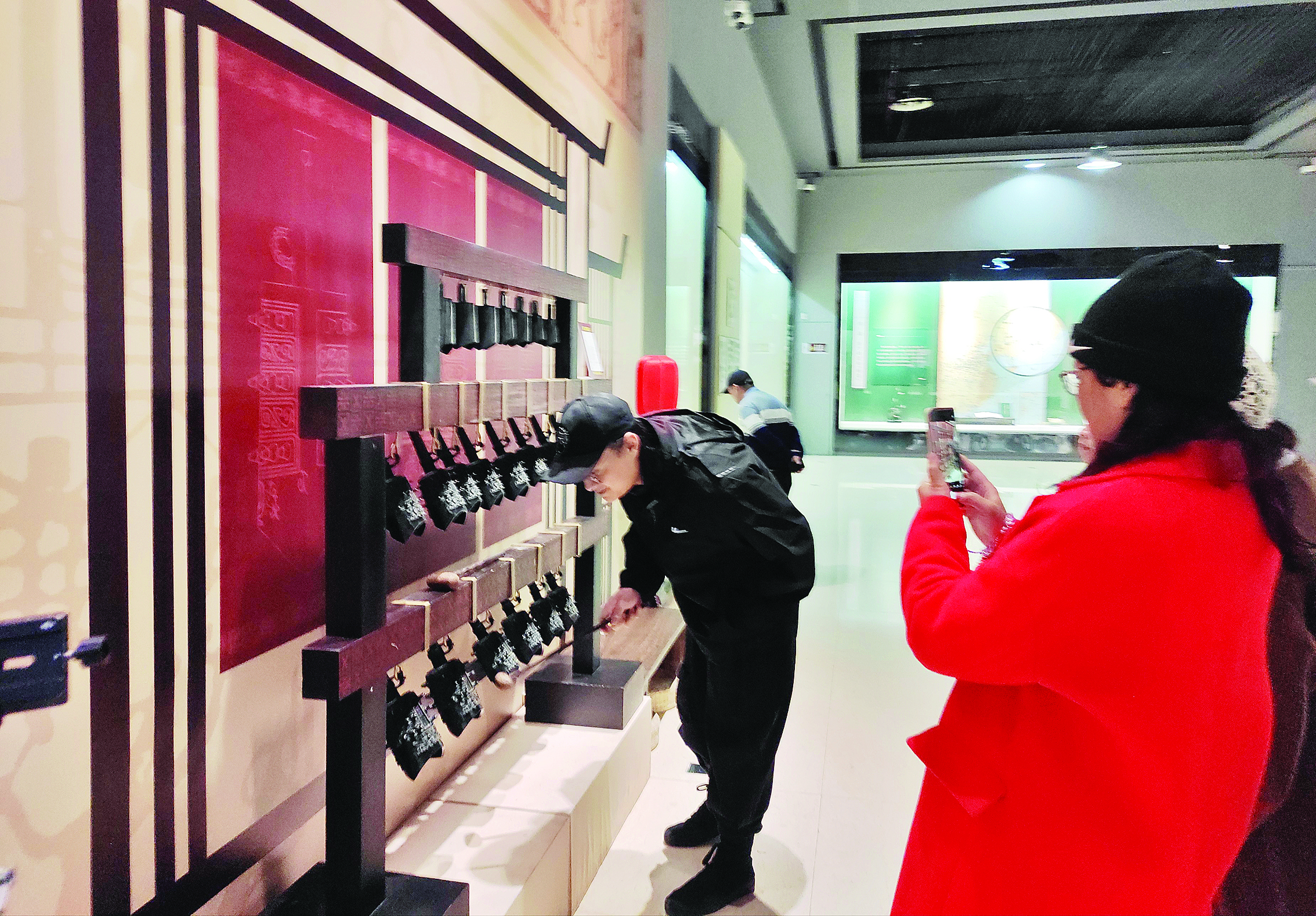 在惠州博物館,市民體驗編鐘(仿制)演奏。