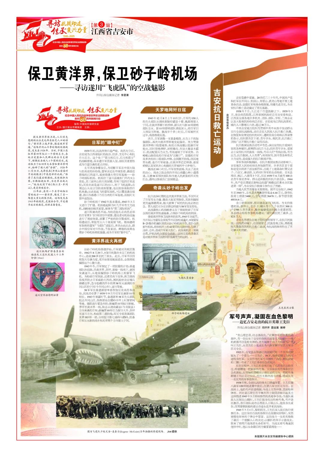 遂川距離南昌不遠,為防范駐扎在南昌近郊的日軍第3飛行師團空中偵察,建設者對機場設施進行了周密偽裝,部署了嚴密的防空警戒網(wǎng)。機場建成后,常駐有五六十架美制飛機。陳納德將軍指揮的盟軍“飛虎隊”進駐后,多次由此出擊,聯(lián)合中國空軍對日作戰(zhàn),予敵重創(chuàng)。輝煌的戰(zhàn)果也使砂子嶺機場徹底暴露,成為日軍的“眼中釘”。