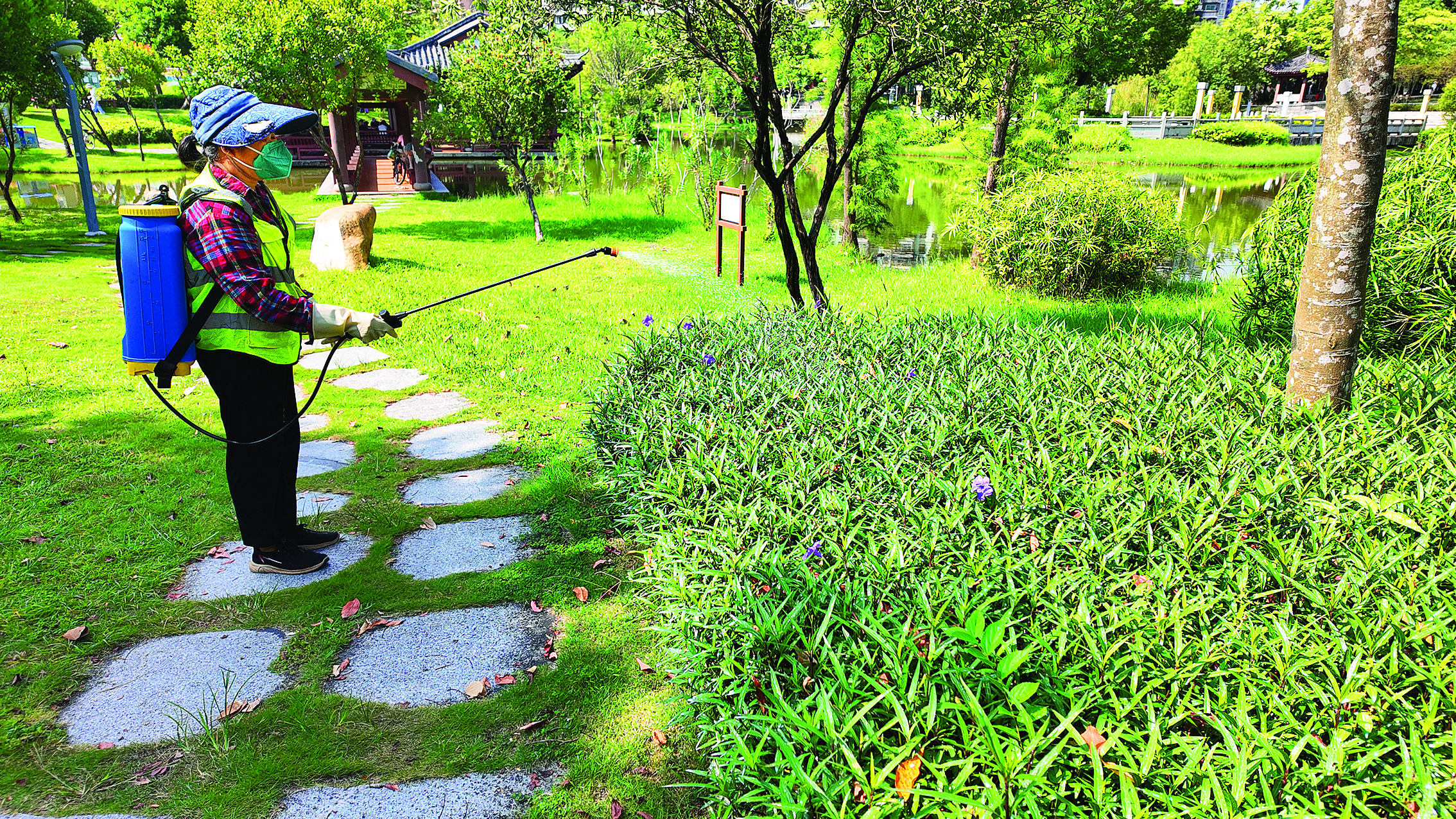 在新湖公園,工人定時(shí)進(jìn)行消殺作業(yè)。