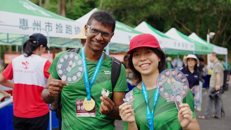有了兩位“小網(wǎng)紅”的助力,選手們參與環(huán);顒(dòng)的熱情更加高漲了。大家將垃圾帶回終點(diǎn)后,迫不及待地領(lǐng)取文創(chuàng)產(chǎn)品。來(lái)自澳大利亞的Ravi Sundar第一次在中國(guó)參加這么大型的徒步活動(dòng),在領(lǐng)到“游游”“玩玩”的文創(chuàng)產(chǎn)品后,他開(kāi)心地與女朋友拍照留念:“這個(gè)公仔形象很可愛(ài)!