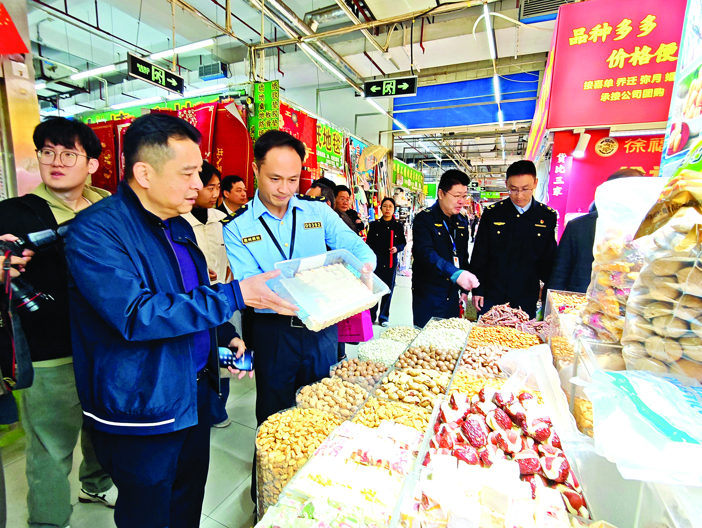 “女士,您最關(guān)心哪種食品的安全?”“我女兒喜歡吃肉脯,想知道它到底安不安全!薄昂,我們就抽檢這個(gè)!毙麓簩⒅,年貨采購進(jìn)入旺季,食品安全成為民生關(guān)注焦點(diǎn)。2月3日上午,惠州市市場監(jiān)督管理局走進(jìn)年貨批發(fā)市場開展“你點(diǎn)我檢掃年貨”活動(dòng),通過隨機(jī)邀請(qǐng)消費(fèi)者“點(diǎn)單”,抽檢了堅(jiān)果、果脯、魷魚絲、奶酥等20批次的食品。完成檢驗(yàn)后,市市場監(jiān)督管理局將及時(shí)向社會(huì)公布抽檢結(jié)果,并對(duì)不合格食品進(jìn)行核查處置。