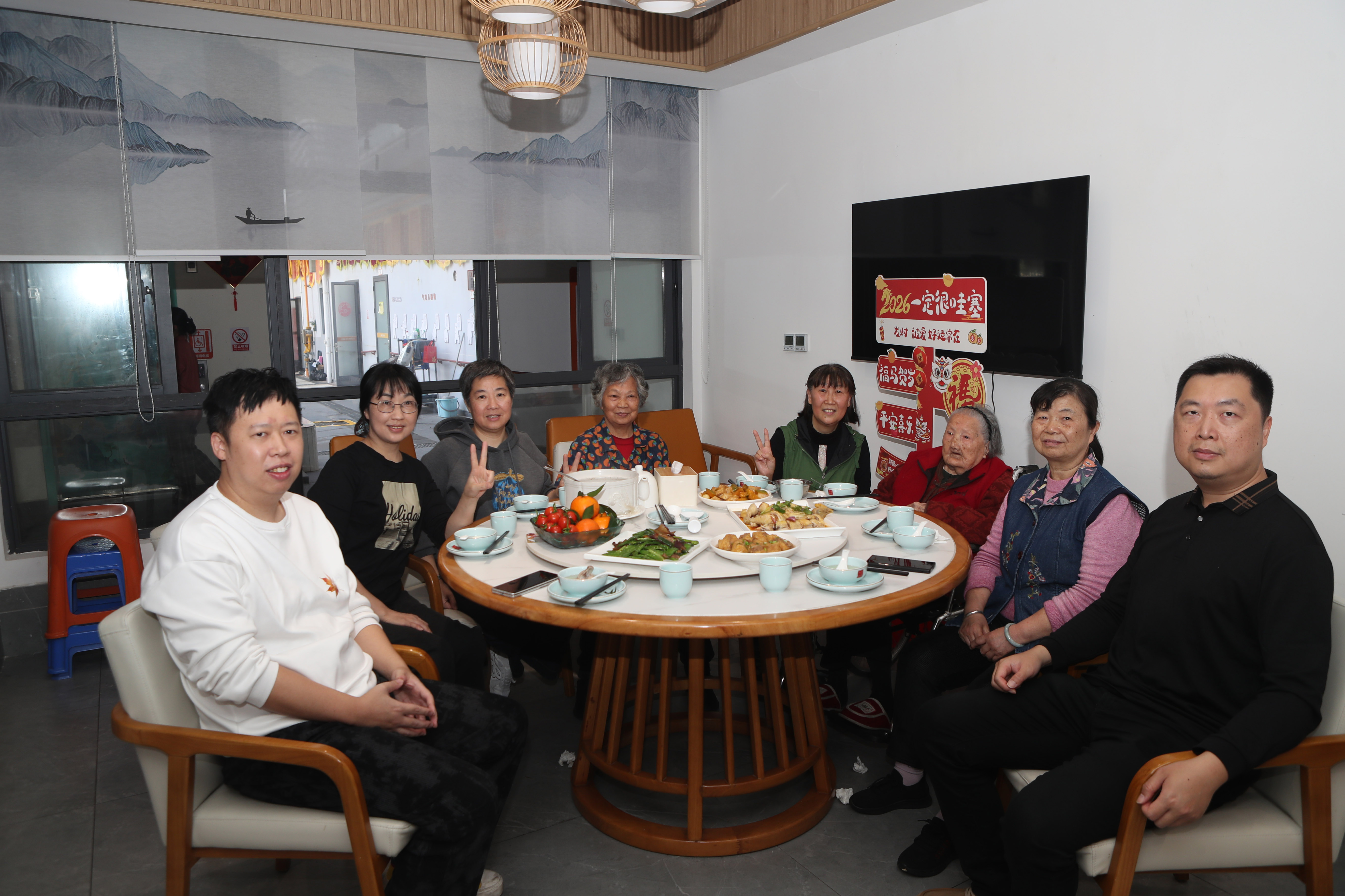 家住市區(qū)的兒女們,隔三差五便會來看望黃婆婆。考慮到老人年事已高、腿腳不便,家里的曾孫輩們又活潑吵鬧,擔(dān)心她回家過節(jié)休息不好,今年大家特意提前預(yù)訂了中心的定制年飯,帶著滿心的愛意,在熟悉又舒適的環(huán)境里,陪老人提前過個熱熱鬧鬧的新年。