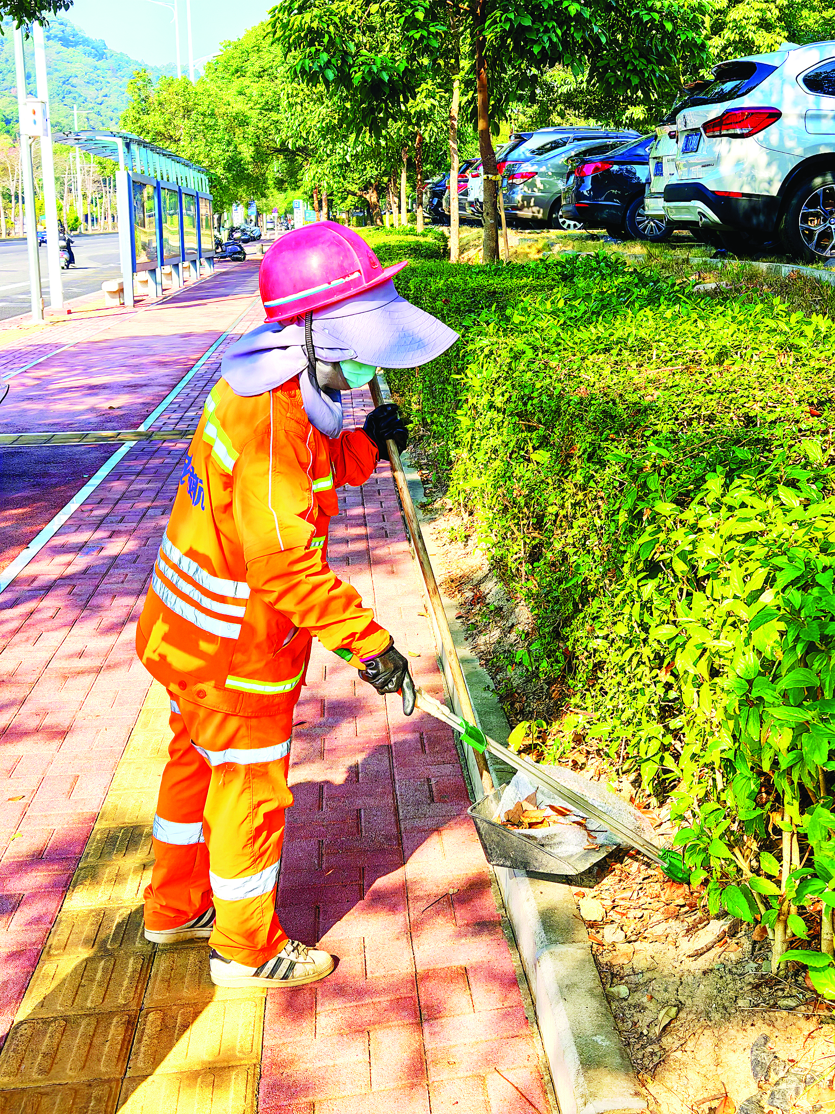 環(huán)衛(wèi)工人清掃綠化帶。
