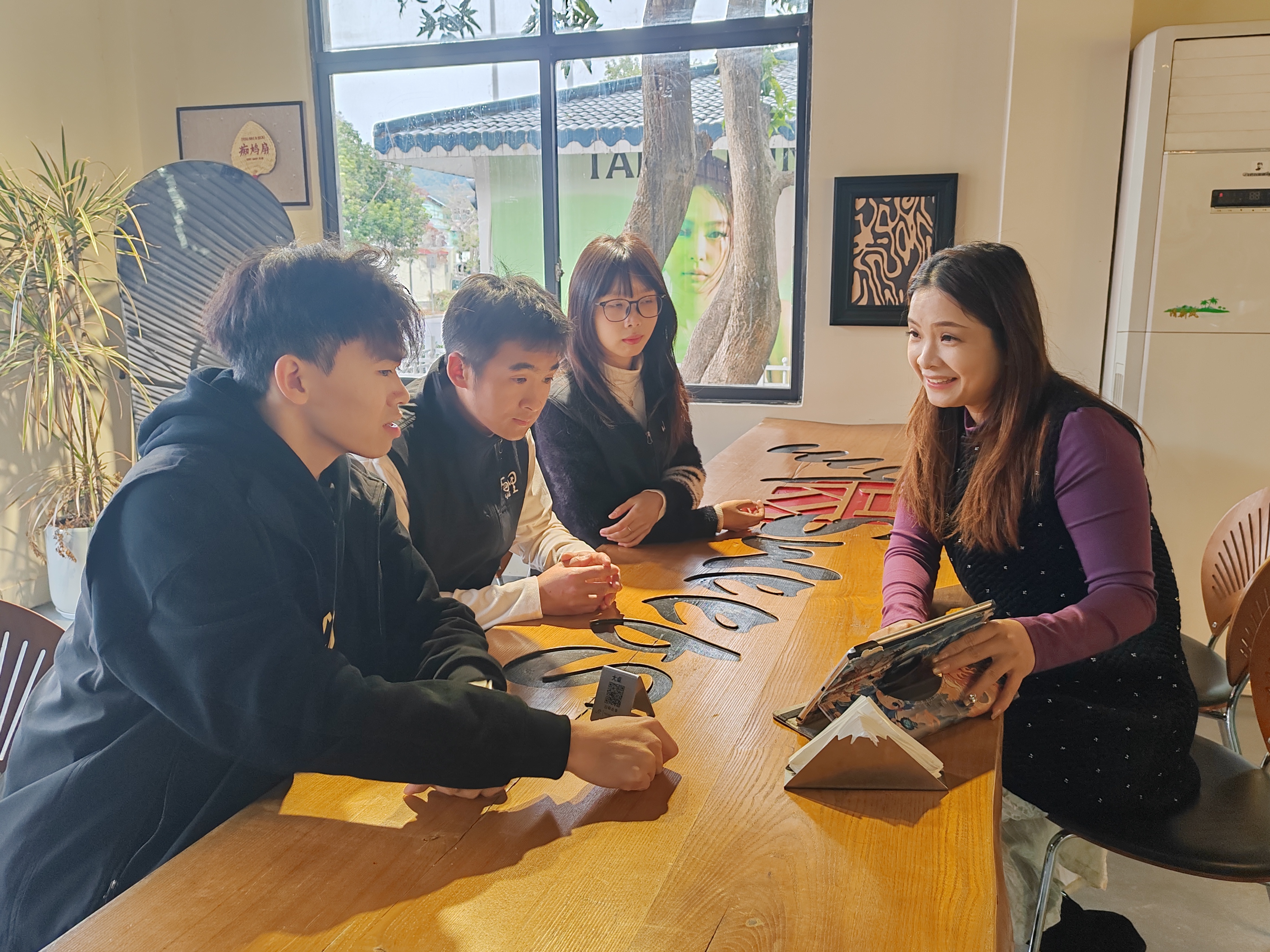 鐘國麗(右一)與嶼里咖啡店工作人員商量新的飲品。
