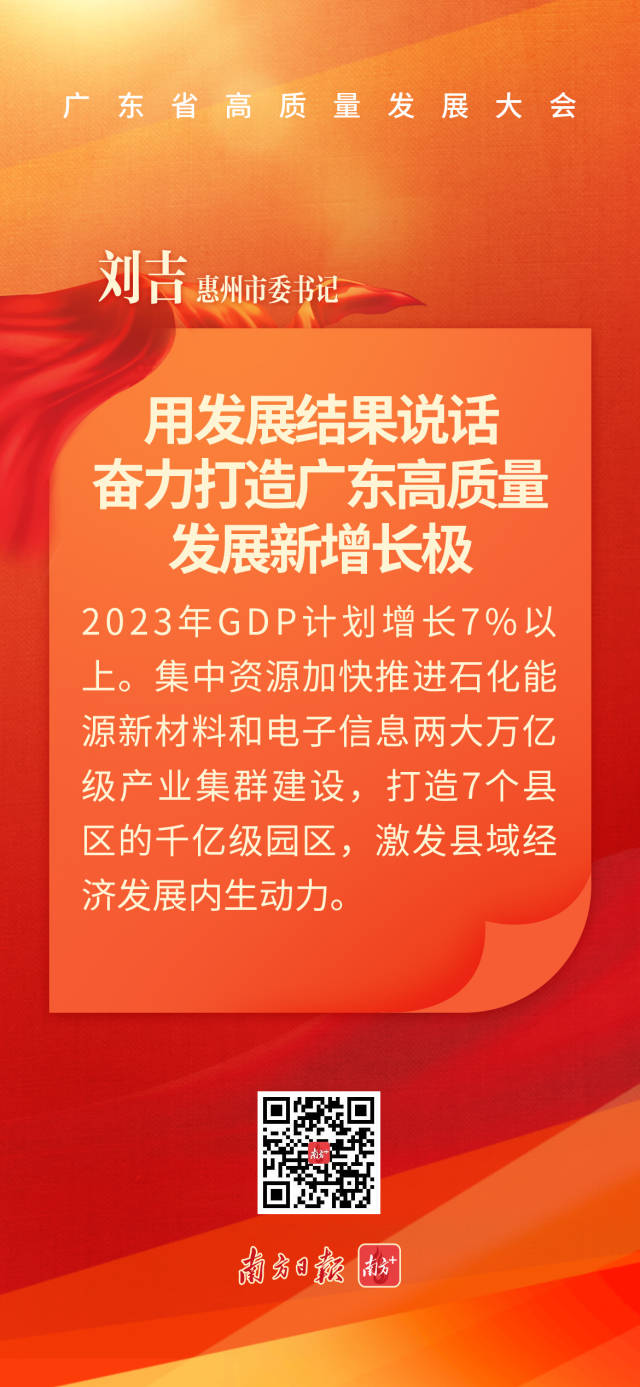 惠州市委書記劉吉表示,省委省政府開年第一天召開這次高質(zhì)量發(fā)展大會,發(fā)出了大抓實體經(jīng)濟、加快高質(zhì)量發(fā)展的動員令;葜輰^發(fā)進取、奮勇爭先,堅決落實好省委制造業(yè)當家戰(zhàn)略,努力交出一份合格的惠州答卷。我們將保持近幾年向上向好的態(tài)勢,2023年GDP計劃增長7%以上。我們將集中資源加快推進石化能源新材料和電子信息兩大萬億級產(chǎn)業(yè)集群建設,不斷增強產(chǎn)業(yè)核心競爭力。我們將做強做優(yōu)3個國家級園區(qū)同時打造7個縣區(qū)的千億級園區(qū),激發(fā)縣域經(jīng)濟發(fā)展內(nèi)生動力。我們清醒認識到高質(zhì)量發(fā)展就是要實干興邦,惠州將腳踏實地、扎扎實實做好自己的事,用發(fā)展結(jié)果說話,奮力打造廣東高質(zhì)量發(fā)展新增長極。