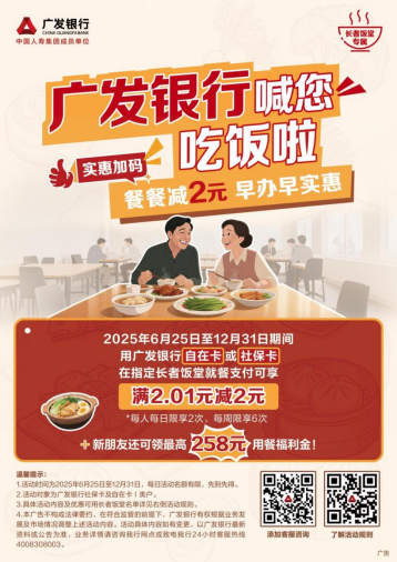 廣發(fā)銀行惠州分行積極響應(yīng)號召,以“長者飯?zhí)脙?yōu)惠活動”為切入點,將金融服務(wù)深度融入社區(qū)養(yǎng)老場景,讓長者在家門口就能享受便捷、實惠的助餐服務(wù)。目前惠州市就餐優(yōu)惠活動覆蓋的單位有金沙俊園長者飯?zhí)、城惠美食堂(德信居店)?家食堂,在2025年6月25日至12月31日期間,持有廣發(fā)銀行養(yǎng)老專屬“自在卡”或社?ǖ目蛻粼谝陨蠁挝痪筒,每人每天享有2次、每周享有6次滿2.01元立減2元的優(yōu)惠。未來,該行將持續(xù)擴(kuò)大覆蓋范圍,讓普惠金融惠及更多長者。