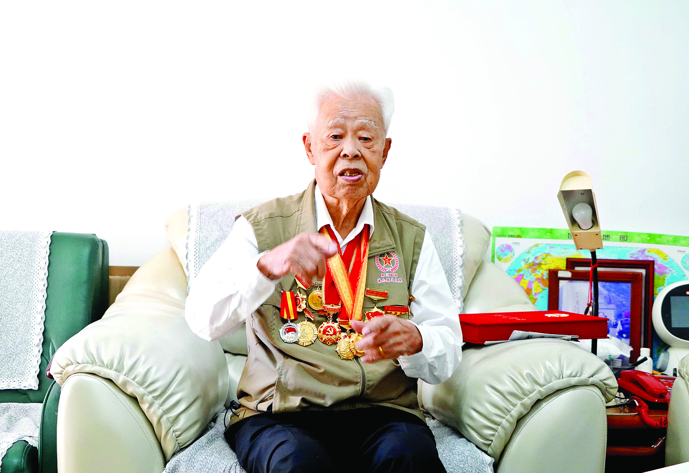 腰板挺直、精神矍鑠,初見羅競輝,94歲的他面帶微笑,精氣神很足。他站立在家門口,與到訪者一一握手、問好,胸前一枚枚勛章熠熠生輝,讓人仿佛看到當(dāng)年那個在驚濤駭浪中,與日寇反復(fù)周旋的英勇少年。