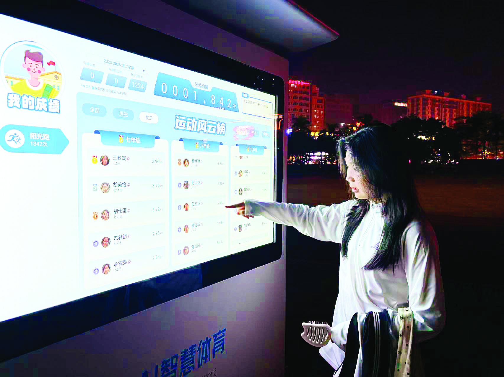 學(xué)生在查看智慧跑道上的“運(yùn)動(dòng)風(fēng)云榜”。