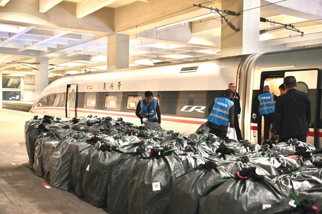 11月15日凌晨5時(shí),漢口站站臺(tái)上,已裝袋整齊的服裝、生鮮、電子產(chǎn)品等10噸快件有序擺放,鐵路工作人員正將包裹搬進(jìn)高鐵車廂。當(dāng)天,DJ892次和DJ890次高鐵動(dòng)車組列車分別從漢口站和廣州白云站開出,華中地區(qū)與粵港澳大灣區(qū)新添高鐵快運(yùn)線路。