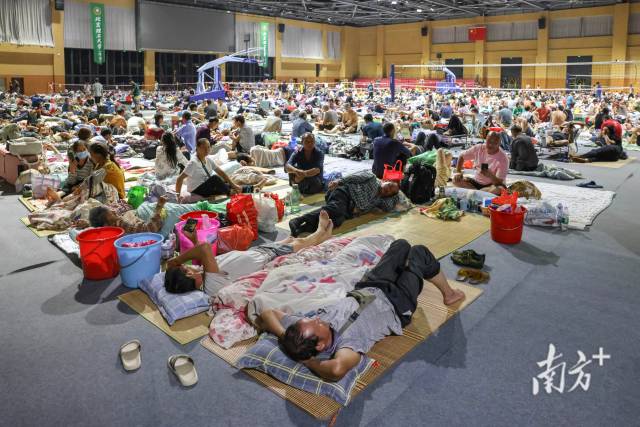珠海已迅速開放應急避難場所。圖為北京理工大學(珠海)的體育館內,安置于此的約2000名建筑工友正在休息。南方+記者 鄭新洽 董天健 攝