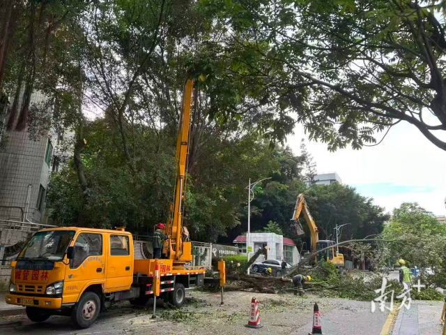臺風來臨前,園林部門工作人員正在對樹枝進行裁剪。受訪者供圖