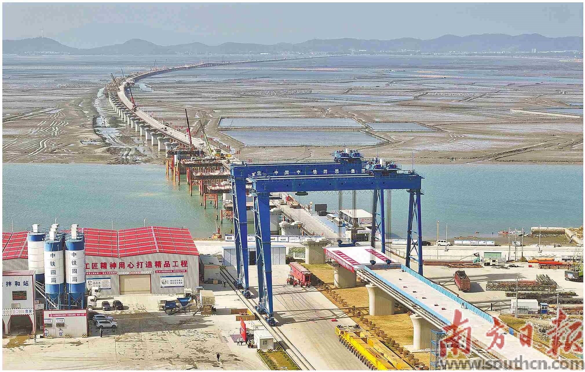 11月26日,在漳汕高鐵福建段東山跨海特大橋施工現(xiàn)場,隨著一榀重達數百噸的箱梁精準安放在橋墩上,漳汕高鐵全線進入跨海大橋架梁施工階段。此次完成首榀箱梁架設的東山跨海特大橋全長20.26公里,是漳汕高鐵全線最長的跨海橋梁。