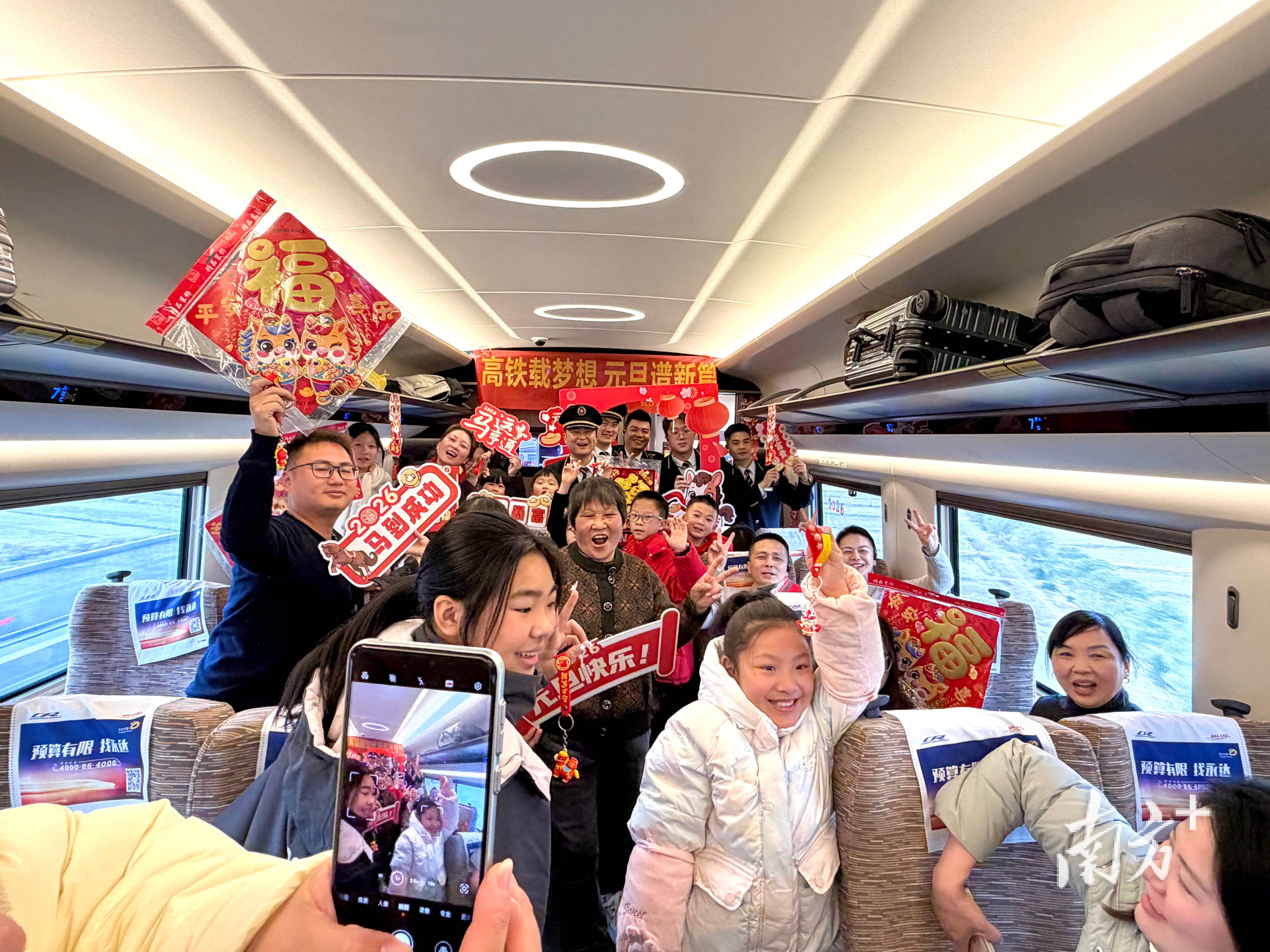 廣湛高鐵列車上,也洋溢著濃濃的節(jié)日氣息。G5237次復(fù)興號(hào)列車上還舉辦了跨年有獎(jiǎng)問(wèn)答活動(dòng)熱。“廣湛高鐵全線最長(zhǎng)的隧道叫什么名字?”列車長(zhǎng)李玉潔的提問(wèn)剛落,湛江籍大學(xué)生小張反應(yīng)最快搶先回答出“公嶺隧道”,身旁的乘務(wù)員立刻送上了刻有湛江海灣大橋線條的黃銅書(shū)簽。“書(shū)簽上的海灣大橋太有家鄉(xiāng)味了,元旦回家儀式感直接拉滿!”小張高興地說(shuō)。