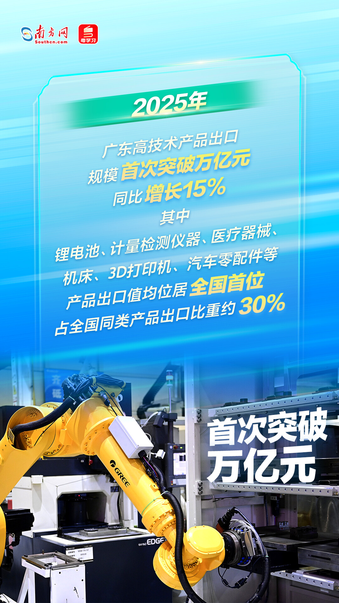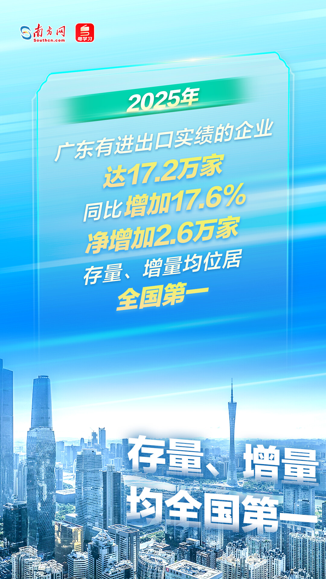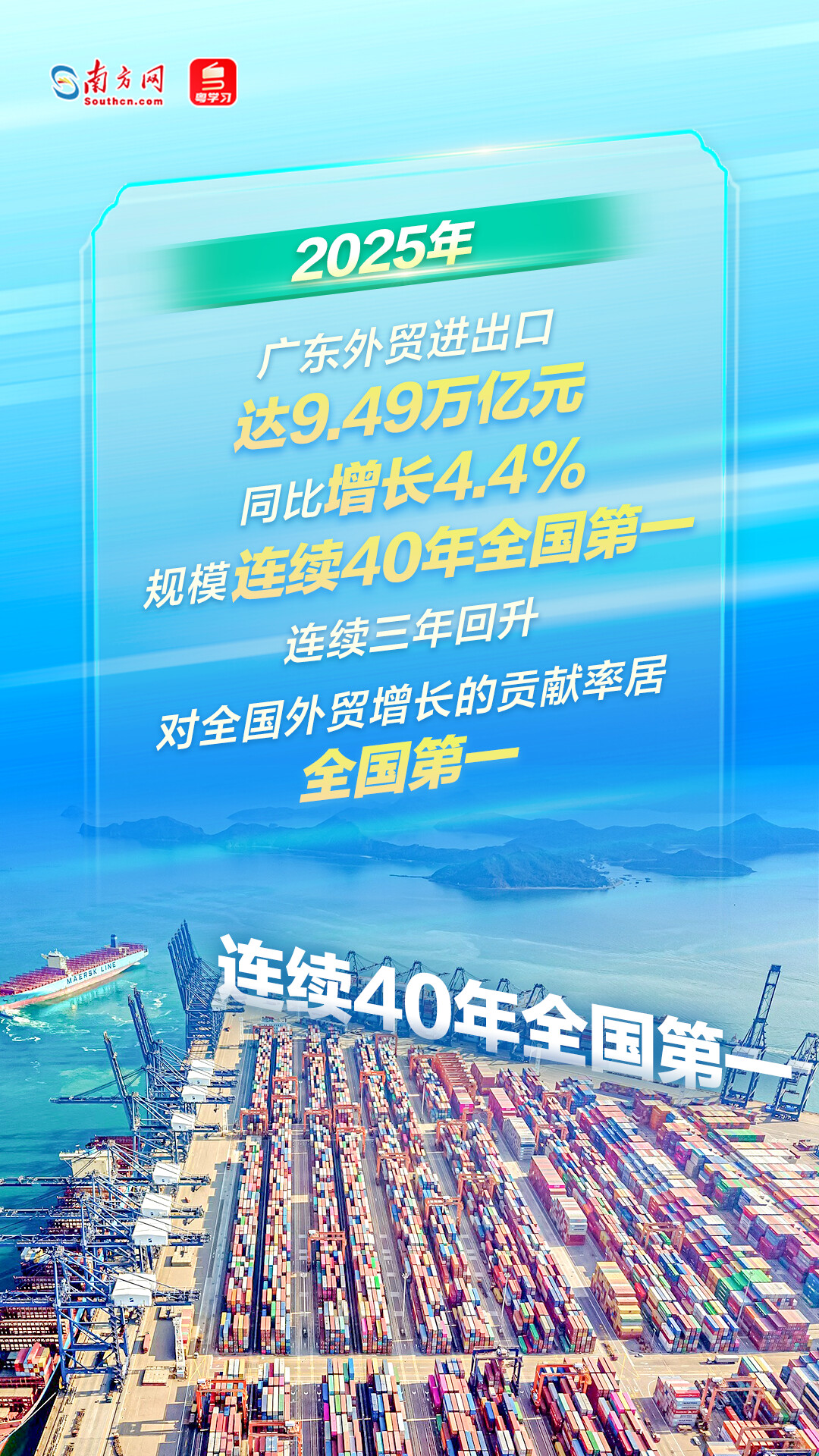 記者從會上獲悉,2025年全年,廣東外貿進出口9.49萬億元人民幣,同比增長4.4%,規(guī)模連續(xù)40年位居全國各省市首位,占全國外貿總值的20.9%,連續(xù)三年回升,對全國外貿增長的貢獻率居全國第一,達24.1%。