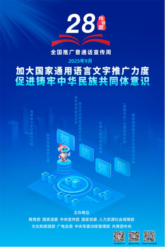 經(jīng)國(guó)務(wù)院批準(zhǔn),自1998年起,每年9月第三周為全國(guó)推廣普通話宣傳周。今年9月15日至9月21日是第28屆全國(guó)推廣普通話宣傳周,主題為“加大國(guó)家通用語(yǔ)言文字推廣力度,促進(jìn)鑄牢中華民族共同體意識(shí)”。
