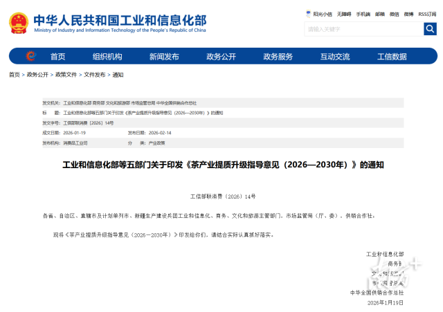 2月14日,工業(yè)和信息化部等五部門印發(fā)的《茶產(chǎn)業(yè)提質(zhì)升級(jí)指導(dǎo)意見(2026—2030年)》對(duì)外發(fā)布。