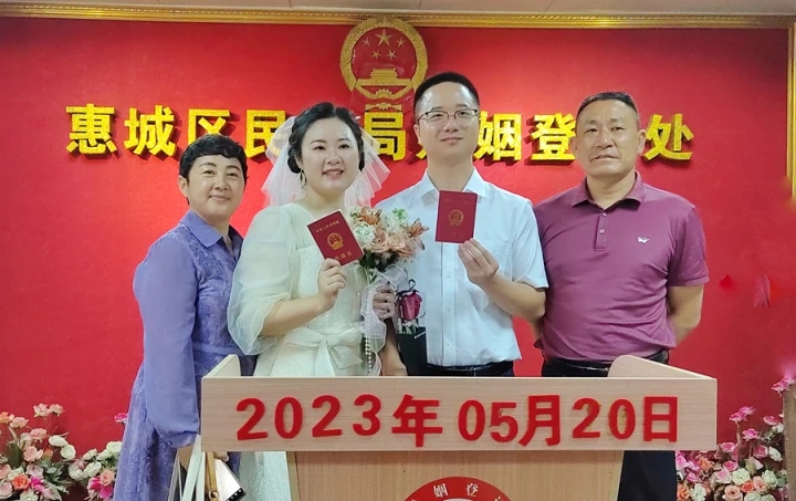 在惠城區(qū)婚姻登記處,(萬先生)一對新人結(jié)婚登記領(lǐng)證后與父母親一起合影。