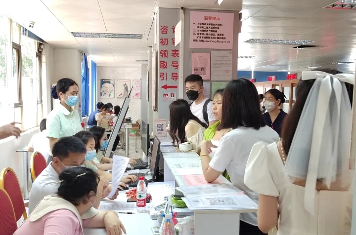 惠城區(qū)婚姻登記處排滿了前來登記結(jié)婚的新人。