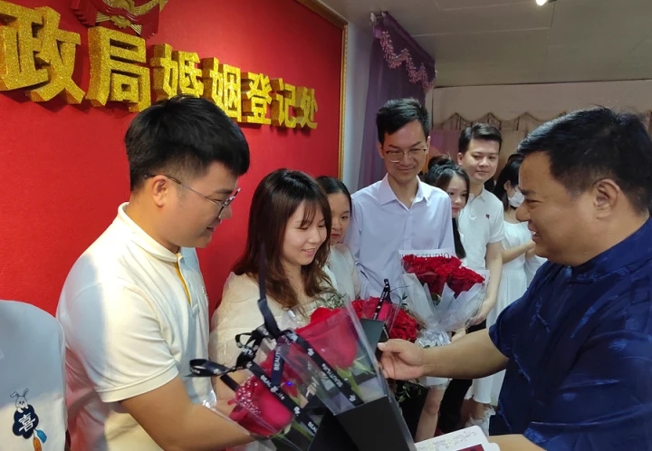 5月20日一大早,許多新人精心打扮,手捧鮮花挽手來到婚姻登記處,場面浪漫溫馨。