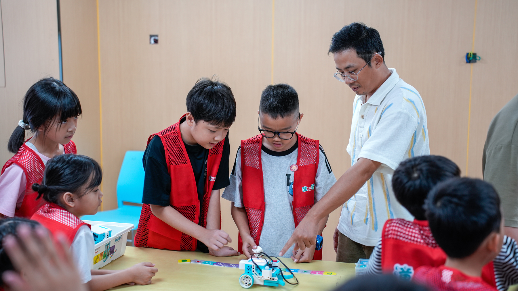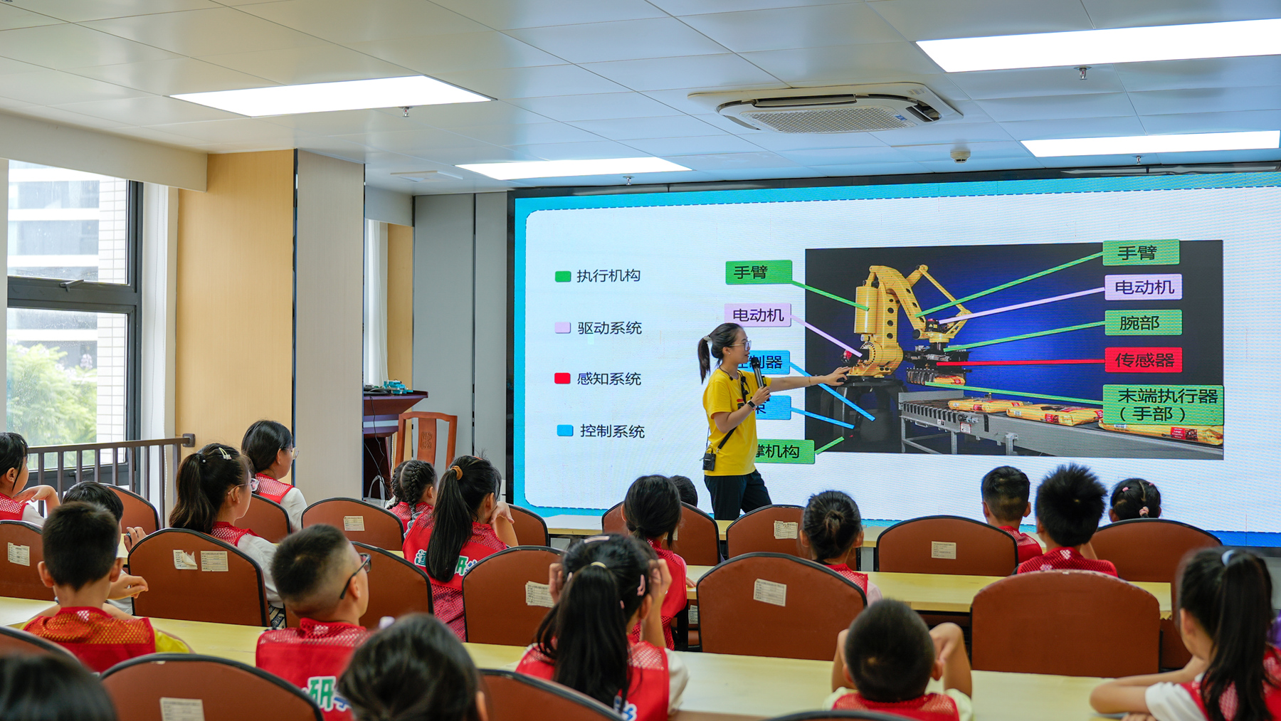 剛到達(dá)活動營地——中韓(惠州)產(chǎn)業(yè)園起步區(qū)黨群服務(wù)中心,孩子們就走進(jìn)了機(jī)器人的知識世界。在這里,他們從了解機(jī)器人的驅(qū)動、感知、控制系統(tǒng)到認(rèn)識手臂、電動機(jī)、傳感器等零部件,以及在醫(yī)療、工業(yè)、運(yùn)輸?shù)榷鄠(gè)領(lǐng)域的神奇應(yīng)用,心中的好奇被瞬間點(diǎn)燃。通過趣味實(shí)踐,孩子們親眼見證這些“法寶”如何讓機(jī)器人擁有“看”和“聽”的能力,原本抽象的科學(xué)原理瞬間變得生動易懂。
