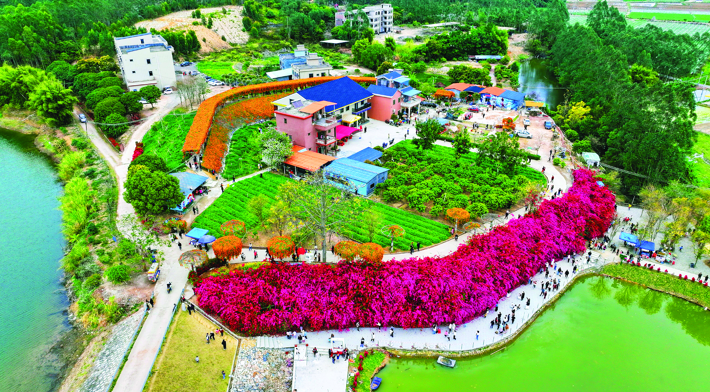 在潼湖鎮(zhèn)黃屋村,三角梅瀑布如霞似錦,這里已成為網(wǎng)紅打卡地!2023年以來,我們年均接待游客10萬人次,帶動村里餐飲、零售等行業(yè)蓬勃發(fā)展。”潼湖鎮(zhèn)相關負責人介紹,黃屋村以三角梅瀑布花嶼項目為核心,打造集花卉觀賞、親子采摘于一體的鄉(xiāng)村旅游景點。目前項目一期已投入200萬元,完成石板路、玻璃護欄、臨時商業(yè)區(qū)等建設;二期計劃投入800萬元,流轉(zhuǎn)土地擴大花海規(guī)模,并配套建設停車場,“建成后預計每年能為村集體增收18萬元!苯酉聛恚(zhèn)還將把花果山、潼湖濕地串成“環(huán)潼湖行”精品文旅路線,讓“打卡流量”變成留住游客的“留量”。