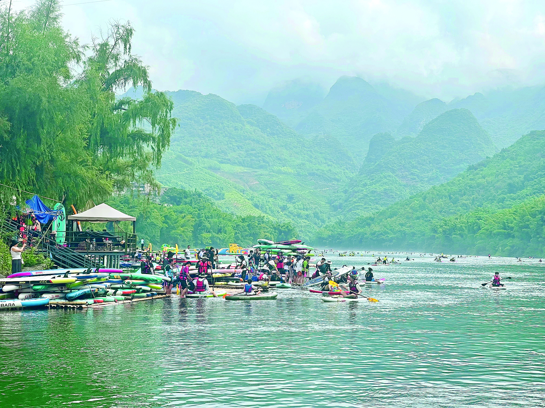 “加油!加油!加油……”去年夏天,2024年中國百城槳板公開賽(安龍站)在此開賽,來自廣東、上海等地的120余名槳板選手在南盤江上競(jìng)技,吸引游客關(guān)注,“壩爾代夫”的美名隨賽事傳遍網(wǎng)絡(luò)。自公開賽在壩盤村舉辦后,這里便成為了槳板愛好者的樂園。游客量平日有約3000人,周末高峰時(shí)段高達(dá)4000余人,勞動(dòng)節(jié)、國慶節(jié)假期每天多達(dá)1.7萬人!皣鴳c假期,僅槳板運(yùn)動(dòng)項(xiàng)目就給村集體經(jīng)濟(jì)增加12萬元收入!比f峰湖鎮(zhèn)壩盤村黨支部書記、村委會(huì)主任陳啟仁說。