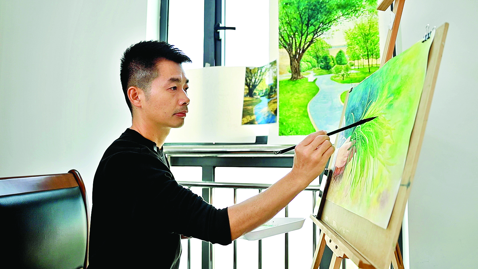 “從去年7月起,我就想把家鄉(xiāng)的變化畫下來,每走一處、每畫一筆,都像在和這片土地拉家常!敝旌1倫鄢弥盹埡蟮拈e暇,牽著女兒的手漫步在村頭公園。河畔紅嶺公園的夕陽、紅頭蔥田的綠浪、古村墻垣的斑駁,都成了他畫筆下最鮮活的素材。