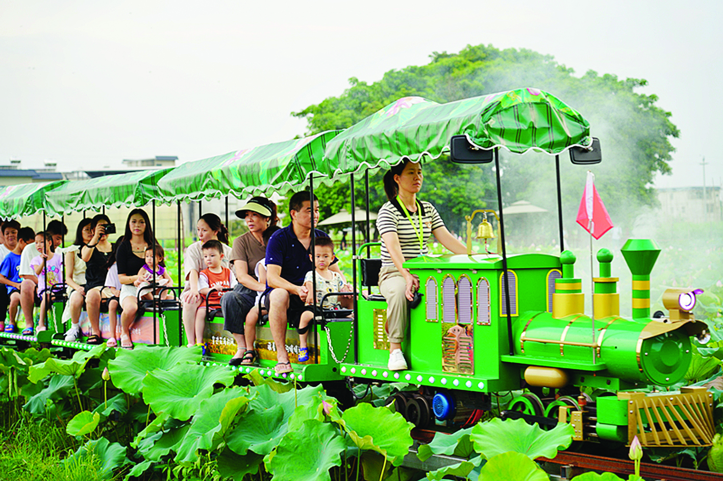 今年,三嘉村百畝荷花園新增的“荷田小火車”項目,成為游客爭相打卡的熱點!白』疖囋诤苫▍仓写┬,荷香陣陣,感覺整個人都放松了!眮碜詵|莞的陳女士帶著家人專程體驗后贊不絕口。這種“低空漫游+高空俯瞰”的立體觀賞體系,讓游客感受到“人在畫中游”的愜意。