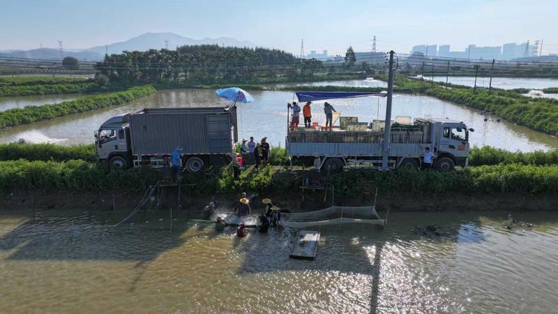 “開捕啦!”當(dāng)天清晨,陽光灑在波光粼粼的魚塘上。與往日不同的是,這一天,工人們抄起了漁網(wǎng),即將上演一番迎豐收的勞作。