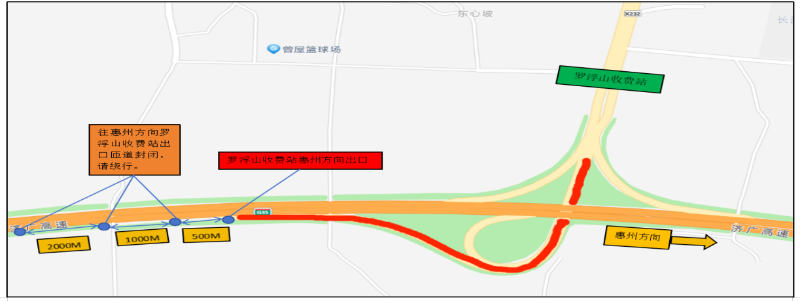 羅浮山收費(fèi)站惠州方向出口匝道封閉示意圖。
