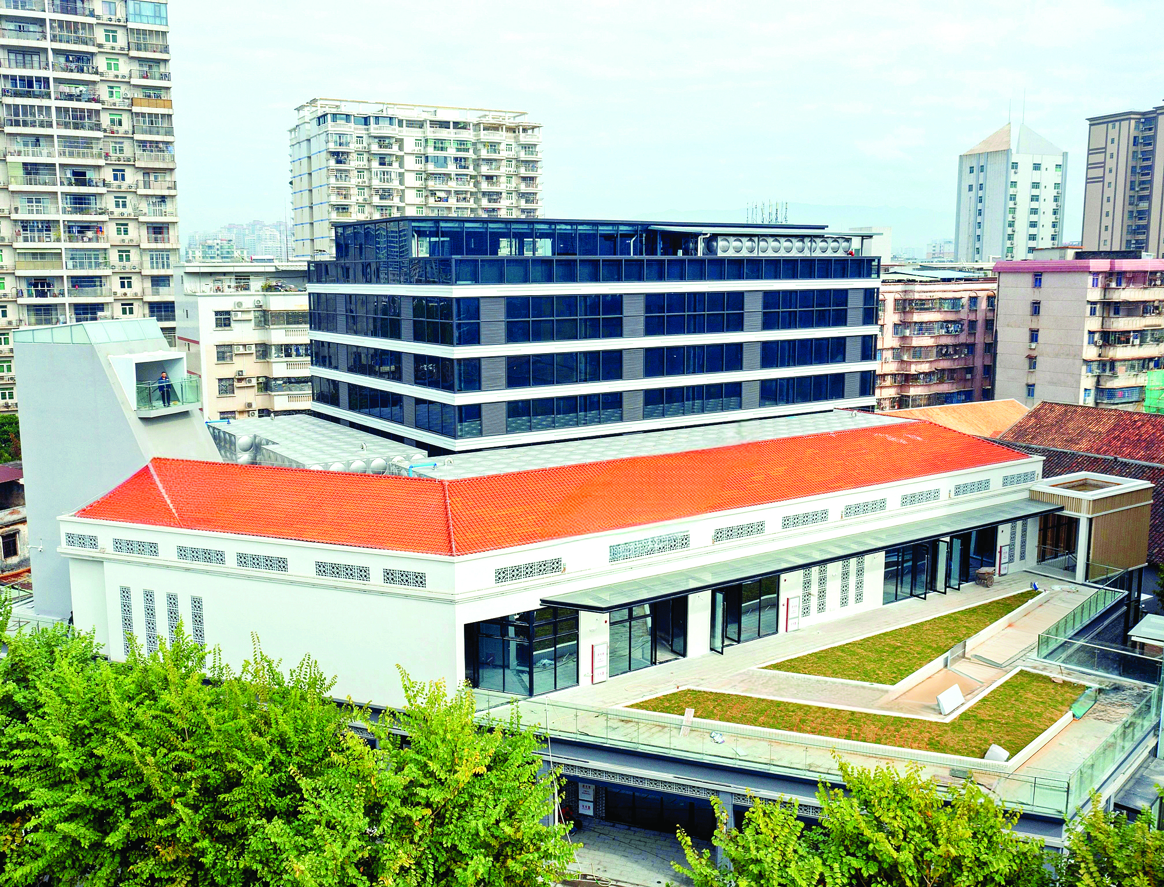沿著環(huán)城路西行,不一會(huì)來到西部集散中心停車綜合配套項(xiàng)目。米白色外墻嵌著鏤空雕花格柵,新嶺南風(fēng)格的裝飾紋樣與青磚墻體相映,既保留了古邑韻味,又帶有現(xiàn)代空間的通透感。在二樓休閑觀光平臺(tái),新種下的草皮綠意盎然,搭配透明玻璃護(hù)欄,是游客休憩觀光的好去處。另一側(cè)的立體智慧停車場(chǎng),可停放180輛車。