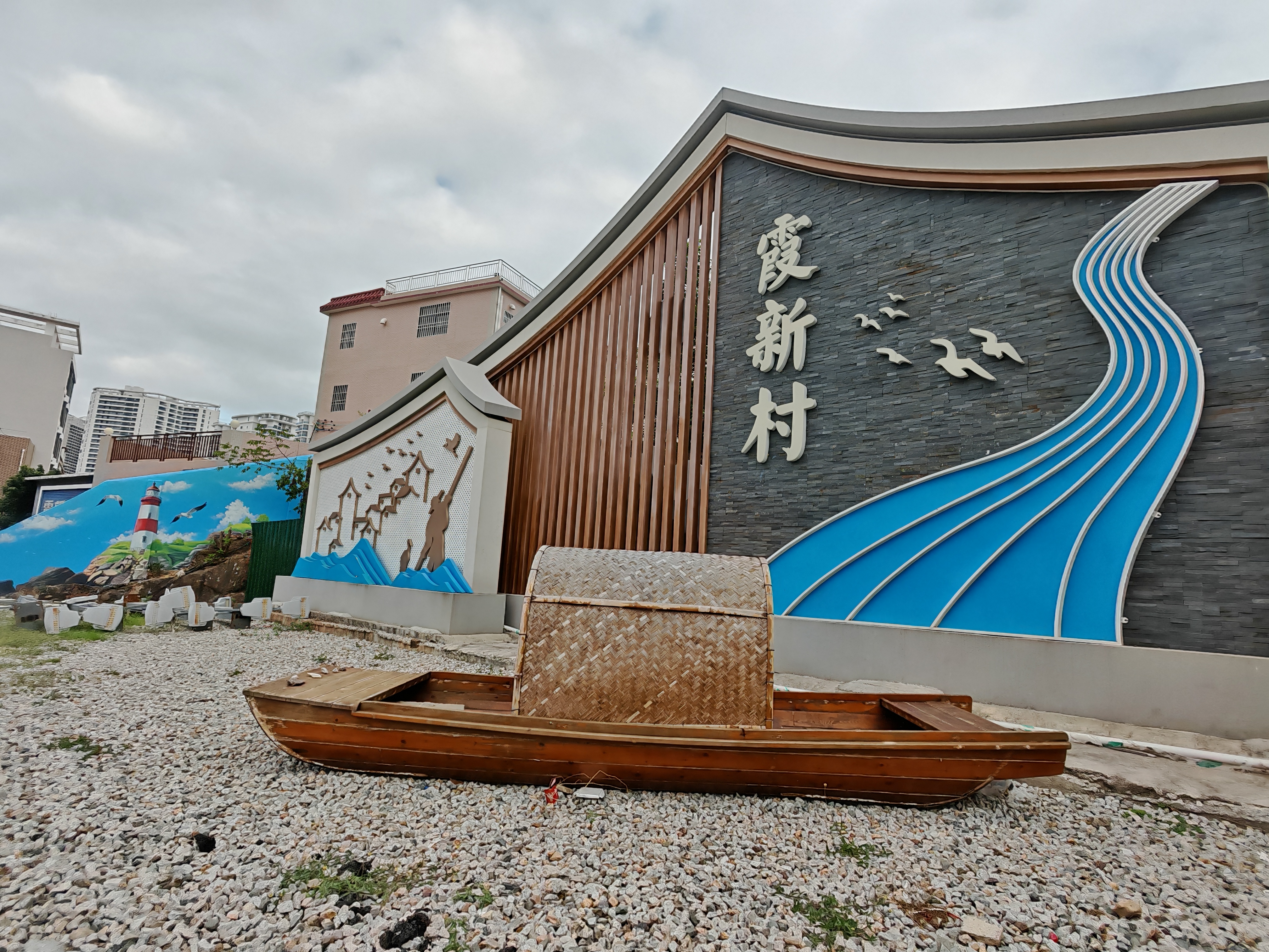 沿著海韻廣場穿過霞新橋,霞新村螺島下的入口處率先帶來驚喜。這里新添了一處醒目的村莊標(biāo)識,整體風(fēng)格以藍(lán)白灰黃為主色調(diào),旁邊的山墻則巧妙畫上了漁村特色墻繪——燈塔矗立、海鳥翩飛,F(xiàn)場還特意擺放了一艘漁船模型,與墻體彩繪相映成趣,還原了傳統(tǒng)漁村的質(zhì)樸風(fēng)貌。而旁邊的登山步道則被巧妙設(shè)計成鋼琴鍵造型,搭配“好好生活、慢慢遇見”“喜歡你的,就叫你霞涌”等暖心文案,讓每一步前行都充滿儀式感。