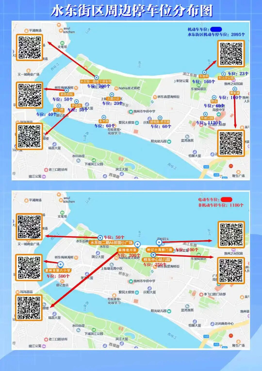 春節(jié)假期(2026年2月16日除夕至2月23日年初七),為方便市民游客出行,堅持“疏導(dǎo)結(jié)合、便民利民”原則,惠城區(qū)橋東街道在水東街周邊設(shè)置機動車、非機動車指定停放點,其中機動車停車位超2000個,非機動車停車位超1000個,掃描停車分布圖二維碼可一鍵導(dǎo)航,直達就近停車場。