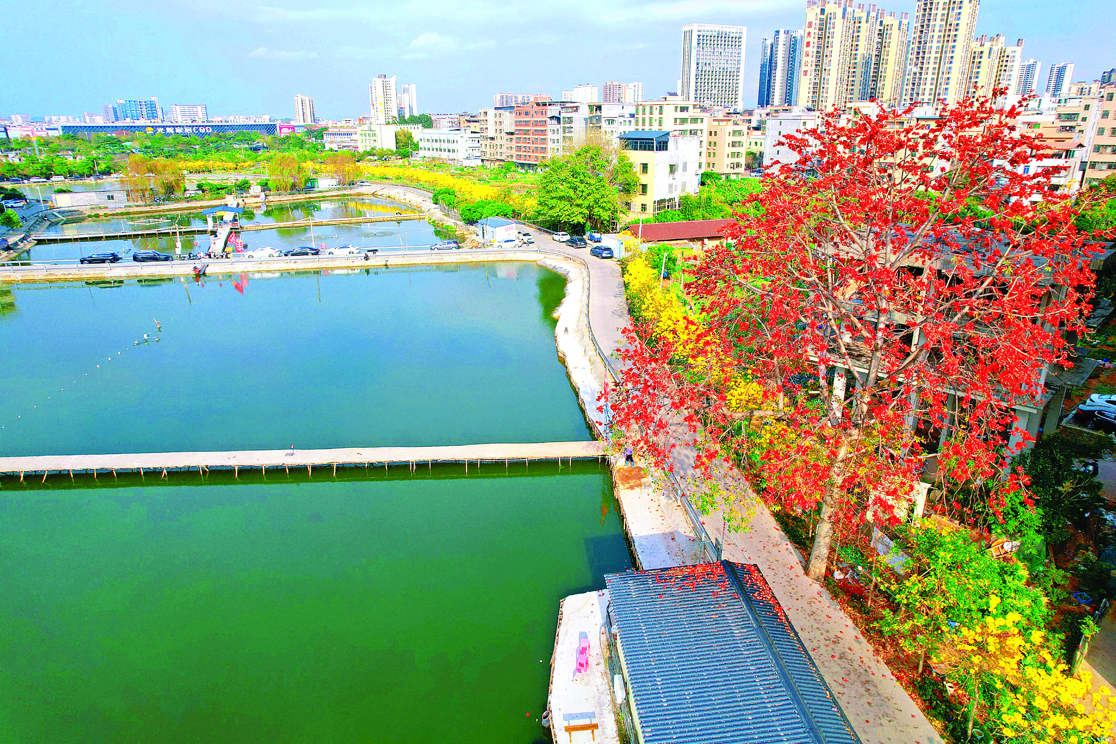 龍津村金黃色的黃花風鈴木與鮮紅的木棉花相映成趣;葜萑請笥浾咧x菁菁 通訊員楊瑜珞 陳巧梅 攝