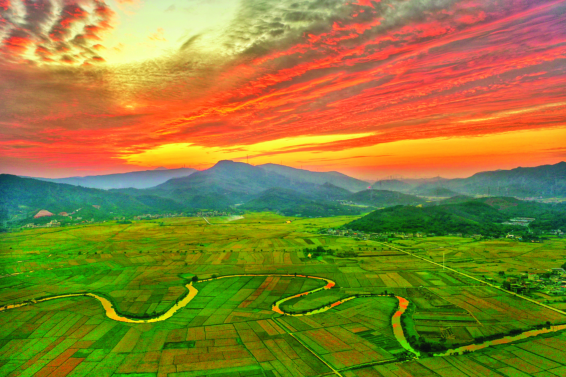 秋日傍晚,惠東縣稔山鎮(zhèn)竹園村稻田一片美麗景象。航拍視角下,黃綠稻浪如調色盤鋪展,蜿蜒河流在晚霞下泛著金波,與遠山、絢爛云霞構成夢幻畫卷。