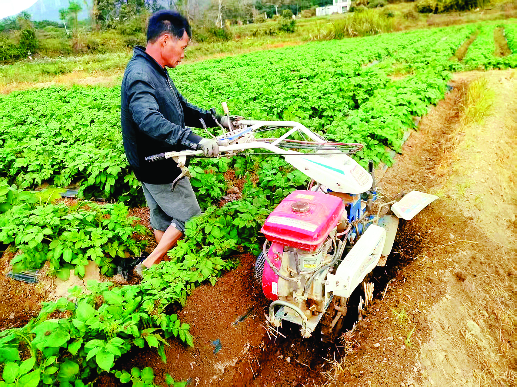 稔山鎮(zhèn)牛牯墩村村民用起壟機給馬鈴薯添土;葜萑請笥浾哔嚱鹄 攝