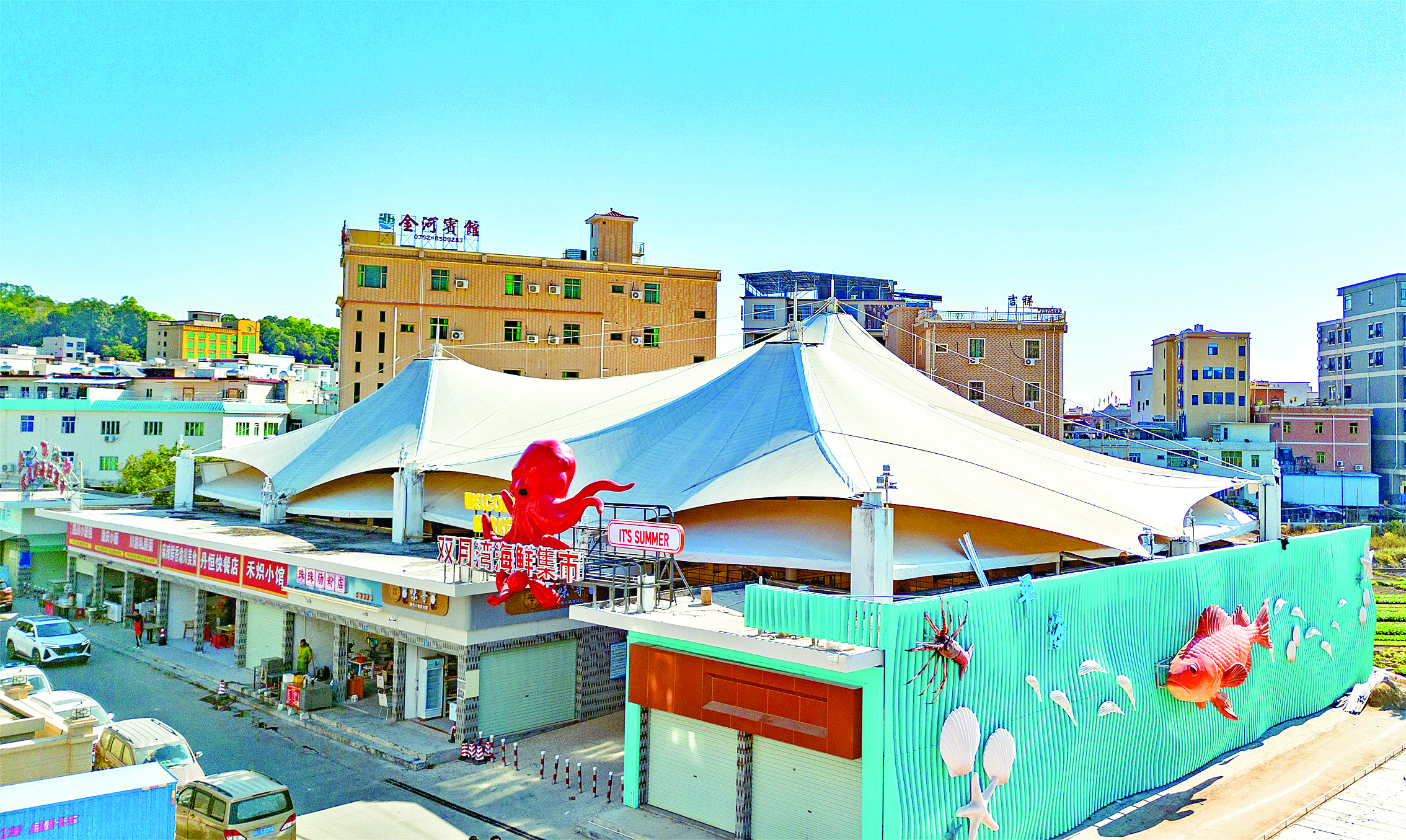 “寄居蟹‘爬’上墻了。”“你看,好可愛的河豚,肥嘟嘟的!薄昂么蟮氖唪~,好逼真!比缃,不少游客來到平海鎮(zhèn)的龍泉大街上,都對(duì)海洋風(fēng)情統(tǒng)一打造的街容街貌贊嘆不已。平海鎮(zhèn)相關(guān)負(fù)責(zé)人介紹,這是該鎮(zhèn)不久前完成打造的濱海風(fēng)情示范主街,也是該鎮(zhèn)美麗圩鎮(zhèn)“七個(gè)一”項(xiàng)目之一。據(jù)介紹,該鎮(zhèn)以龍泉大街為核心,打造全長(zhǎng)1.2公里的濱海風(fēng)情示范主街,以“湖青色+亮白色”為主色調(diào),完成外立面粉刷及全段瀝青路面鋪設(shè),新設(shè)停車位278個(gè),統(tǒng)一沿街200余家商鋪招牌風(fēng)格,96棟連片外立面提升,將寄居蟹、魚蝦等海洋元素融入街景設(shè)計(jì),迎來“全域美”的嶄新蛻變。
