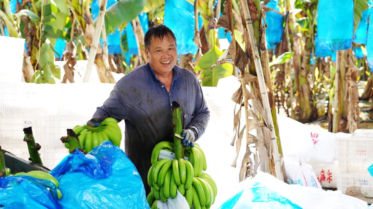 采收現(xiàn)場(chǎng),工人們分工協(xié)作,精準(zhǔn)挑選成熟蕉串,利落地砍下果軸,再用竹扁擔(dān)挑起百斤重?fù)?dān),將果實(shí)完好運(yùn)至田頭運(yùn)輸點(diǎn)。采收后的香蕉被迅速分割成一梭一梭,經(jīng)清洗、分揀、包裝等初步處理后作為優(yōu)質(zhì)農(nóng)產(chǎn)品投放市場(chǎng)。