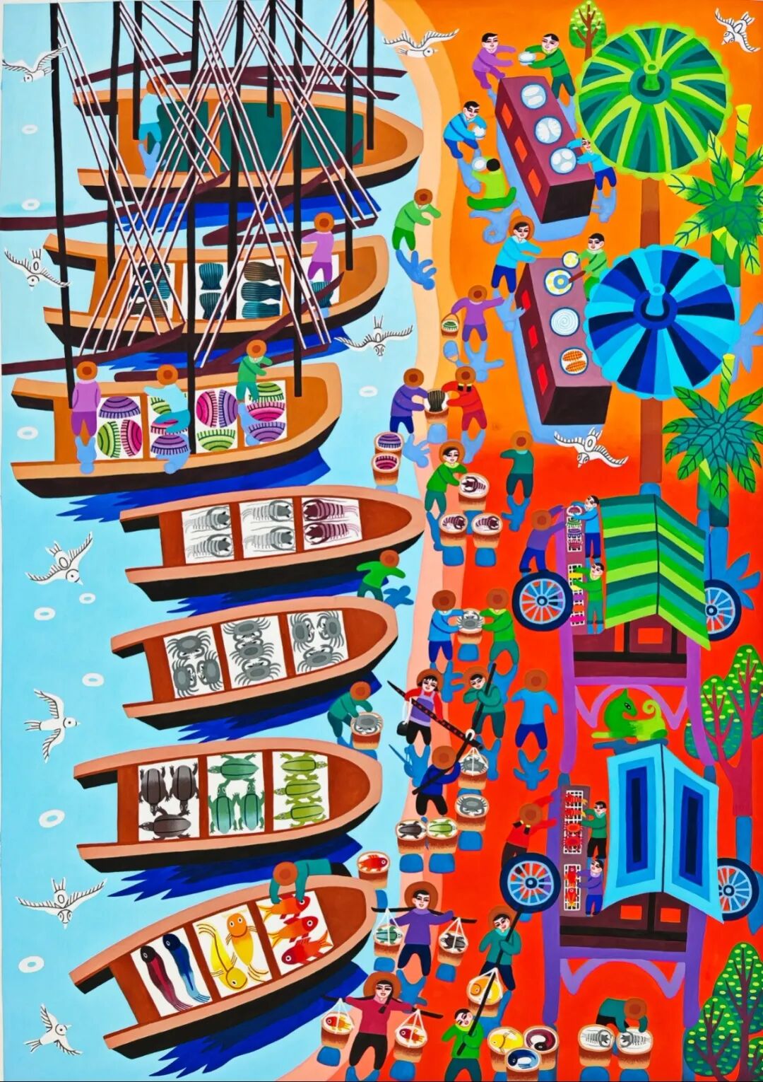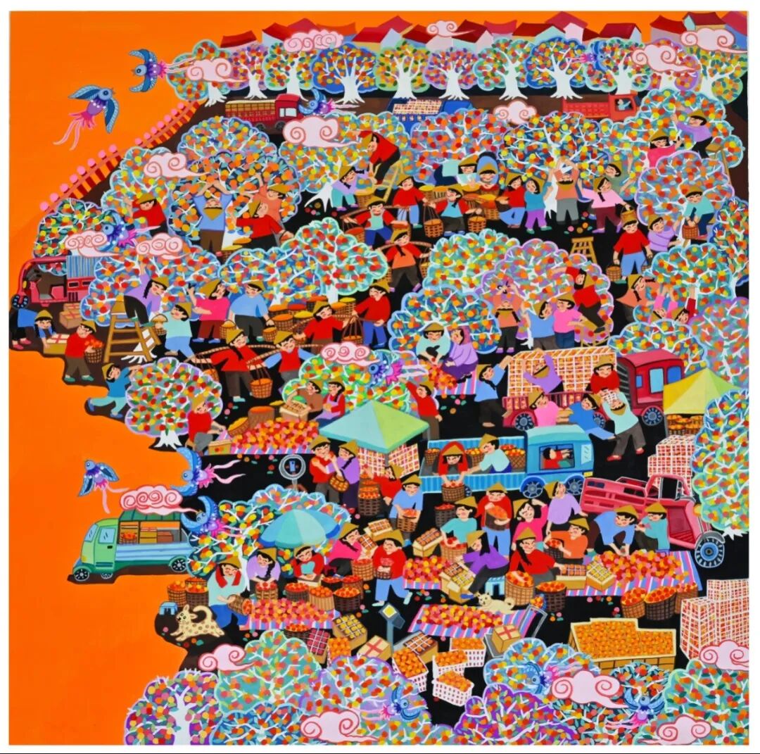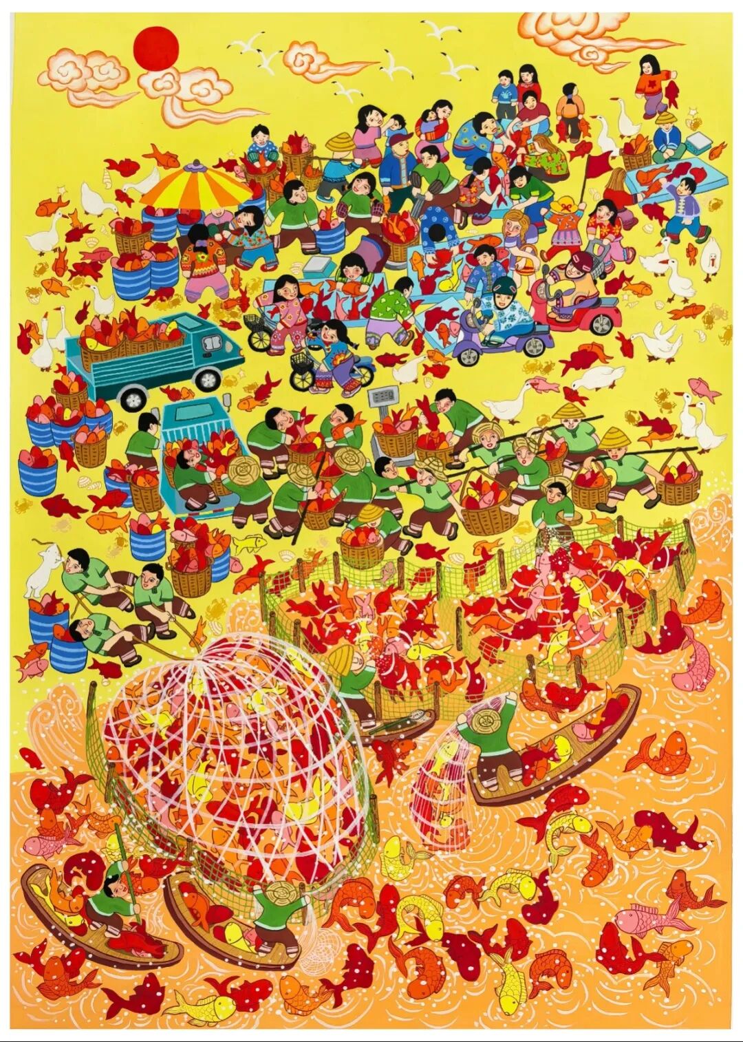 作為“中國(guó)現(xiàn)代民間繪畫(huà)畫(huà)鄉(xiāng)”“中國(guó)民間文化藝術(shù)之鄉(xiāng)”,龍門(mén)農(nóng)民畫(huà)多年來(lái)堅(jiān)持以濃墨重彩記錄生活本真,用質(zhì)樸筆觸傳遞鄉(xiāng)土情懷。此次入選的4幅作品,延續(xù)了當(dāng)?shù)剞r(nóng)民畫(huà)色彩明艷、構(gòu)圖飽滿的藝術(shù)特色,既聚焦嶺南農(nóng)事節(jié)慶、漁鄉(xiāng)市集等傳統(tǒng)題材,又融入新時(shí)代鄉(xiāng)村振興的鮮活氣息,把勞動(dòng)的喜悅、豐收的盛景和群眾對(duì)美好生活的向往,實(shí)實(shí)在在地畫(huà)在了紙上,成為嶺南民俗文化的生動(dòng)寫(xiě)照。