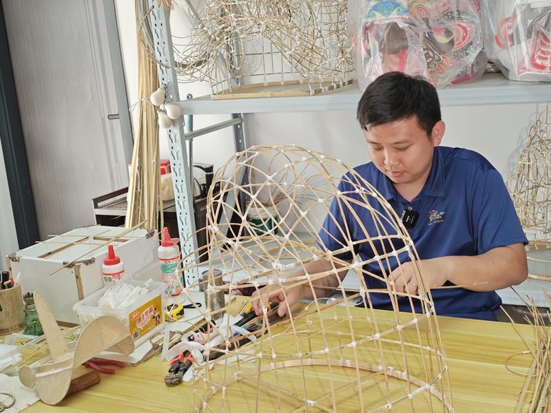 扎和裝兩個步驟最困難。完整制作一個麒麟頭,至少要兩周。其中,扎架子需要一周。“扎架子時,必須確保左右對稱,任何微小的曲度差異都會導致最終效果大相徑庭!鳖佇聶嘟榻B,扎架子的難點在于要扎得飽滿且線條流暢,這需要極高的精準度和耐心!霸谠茏訒r,我會先用竹篾精心編織出麒麟頭的骨架,每一根竹篾都要經過反復測量和調整,確保其對稱性和飽滿度!