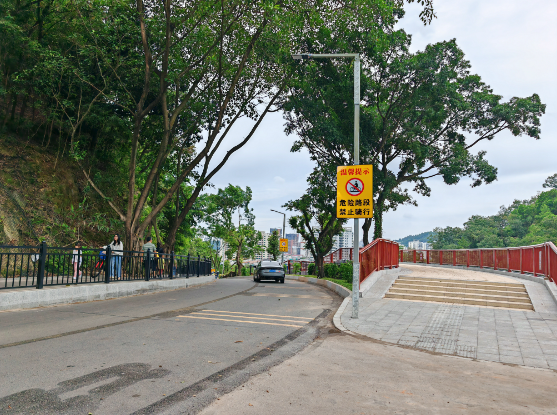東門棧橋建成后,實(shí)現(xiàn)人車分流。棧橋兩側(cè)有“危險(xiǎn)路段,禁止騎行”等溫馨提示牌。