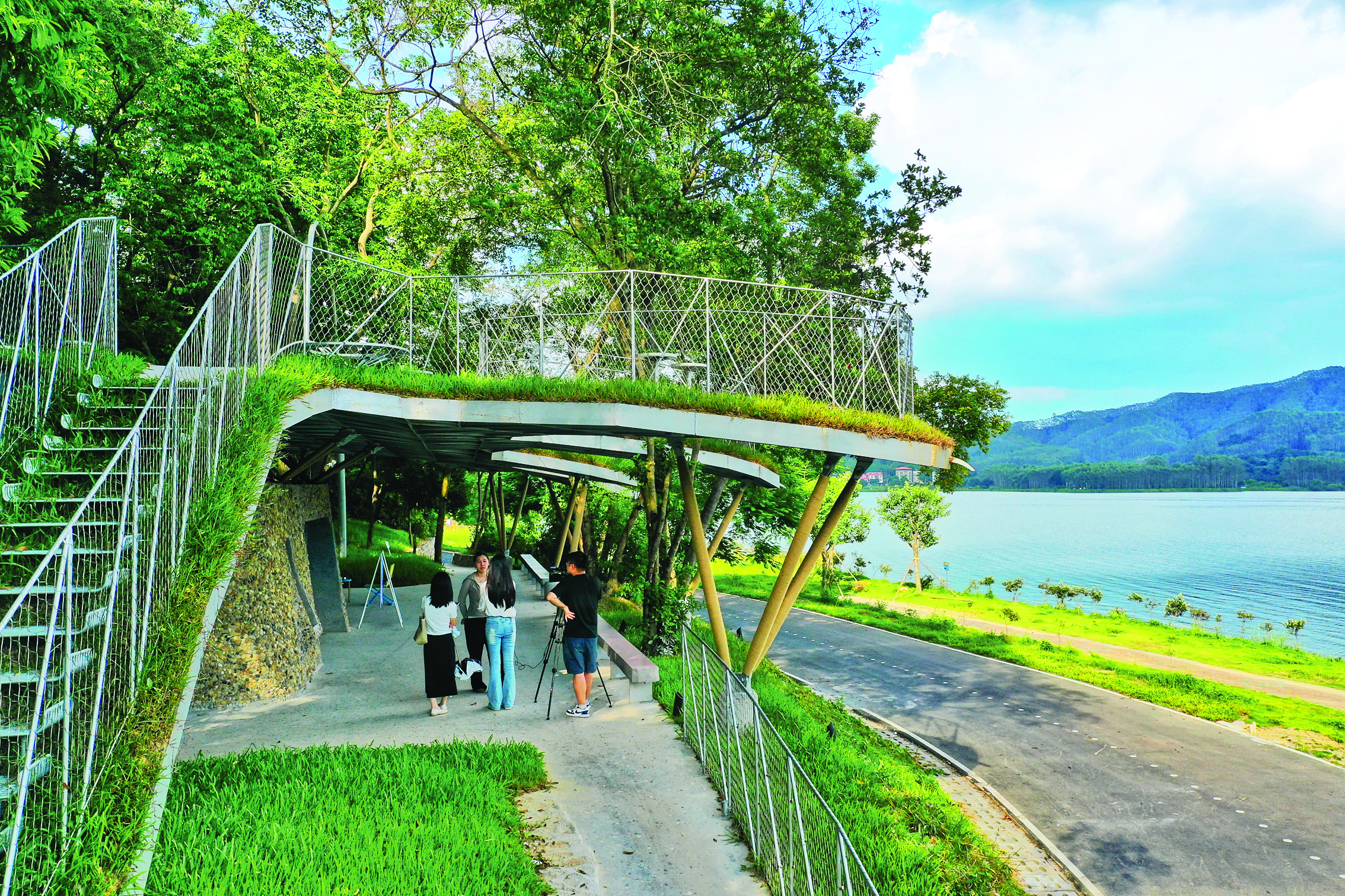 沿公路向山林深處行進,藏于山坡臺地間的“鳳谷驛”,則成為騎行者與游客的“自然休憩站”。記者走訪時看到,驛站以傳統道旁茶棚為意象,搭建起覆土可上人的鋼棚,延伸的挑臺如同“五指”從林間伸出,精準指向開闊的水庫風景;棚頂覆綠與上層臺地無縫銜接,讓建筑仿佛從自然中生長而出。
