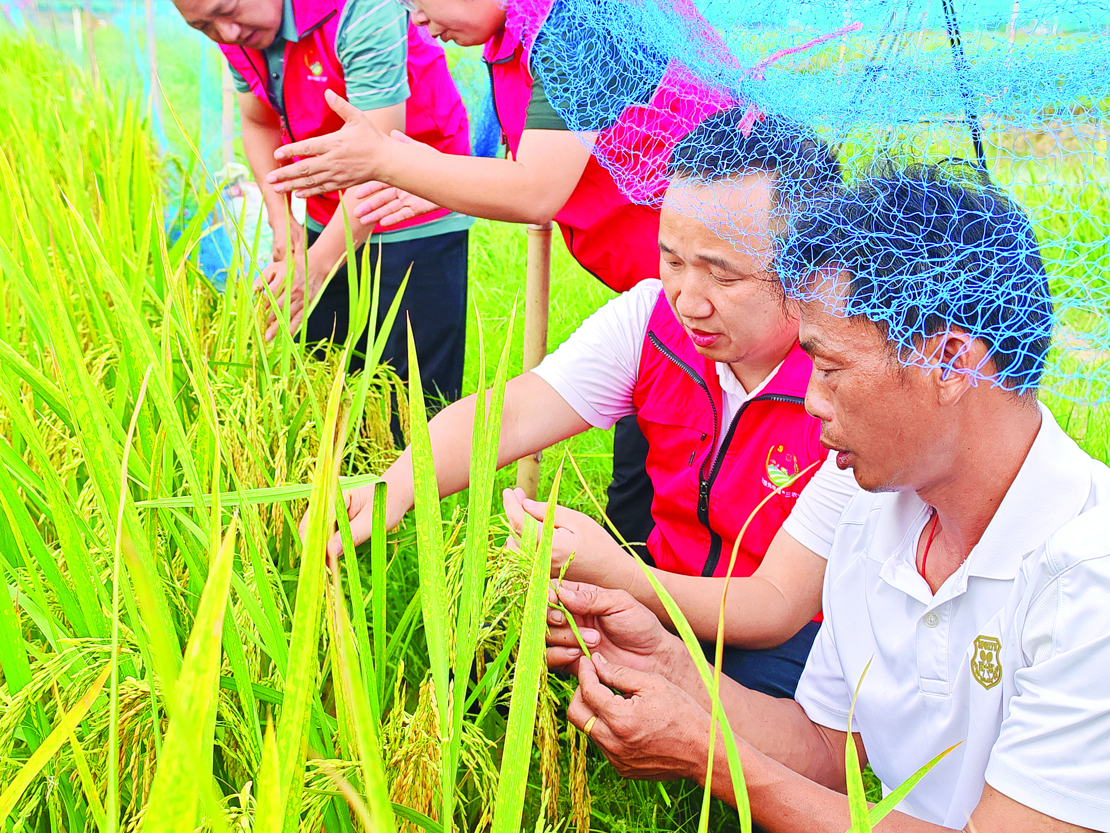 王暢新(右一)在農(nóng)技部門支持下,擴(kuò)大旱稻種植面積,示范種植水稻新品種。 惠州日?qǐng)?bào)記者陳春惠 攝