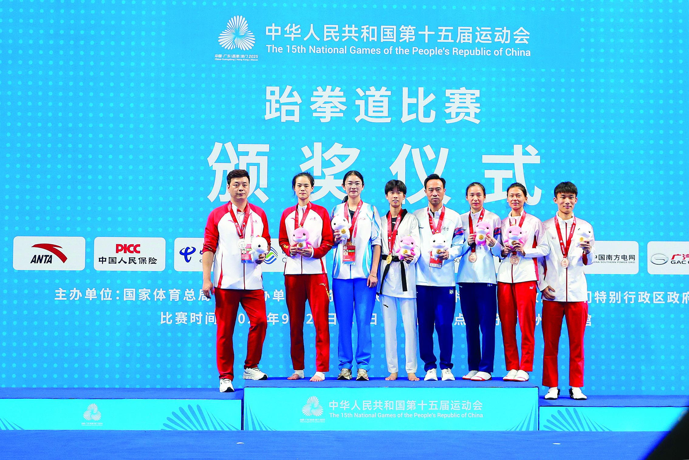 廣東隊選手黃科奮(右)獲十五運會跆拳道男子58公斤級冠軍。頒獎儀式上他和教練員上臺領(lǐng)獎。 惠州日報記者鐘暢新 攝